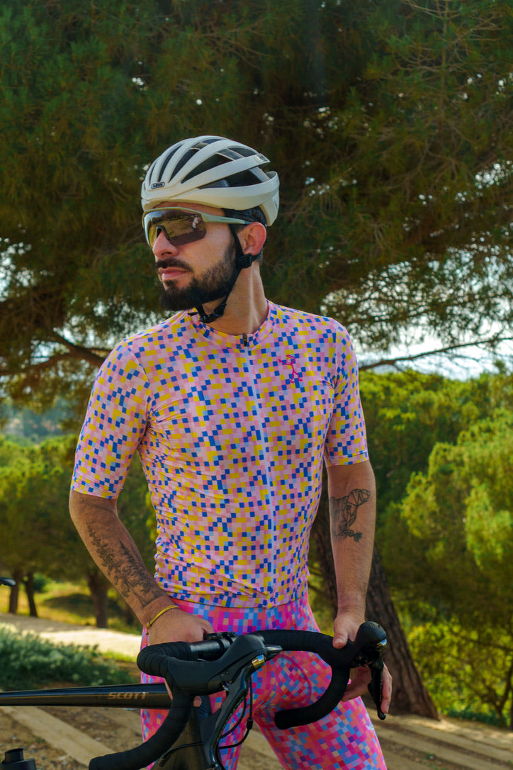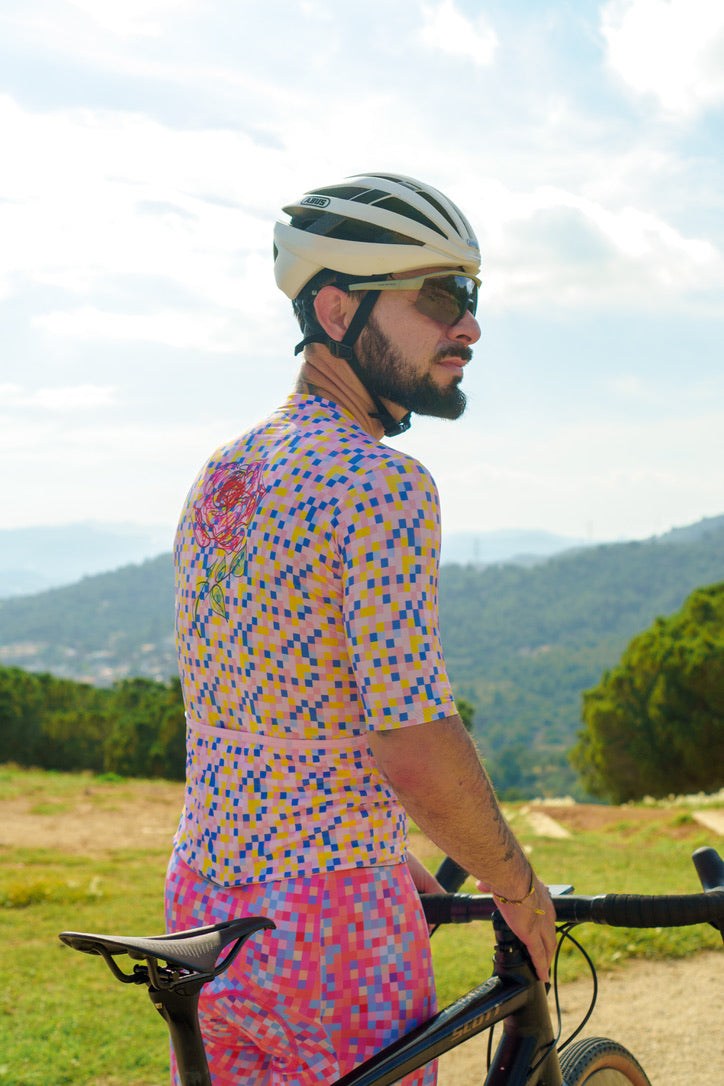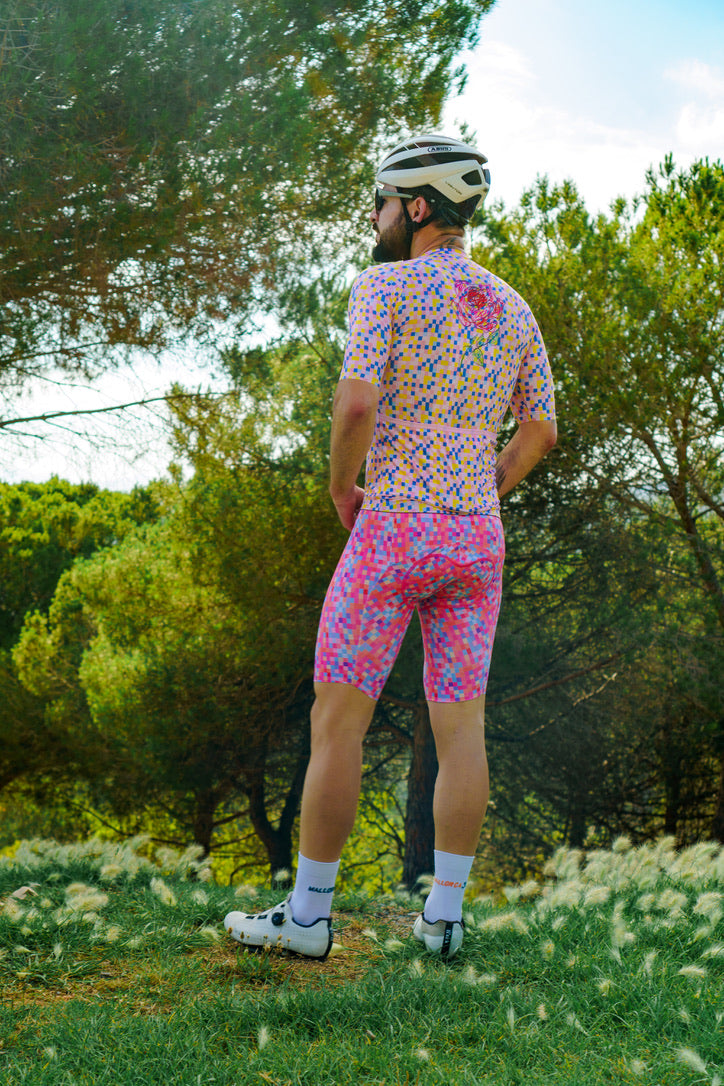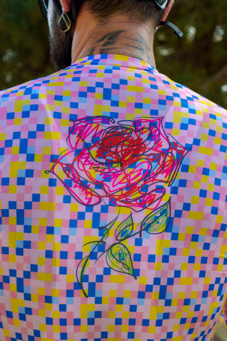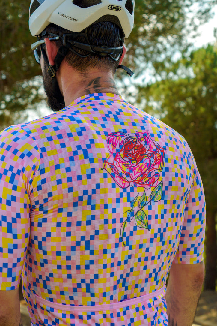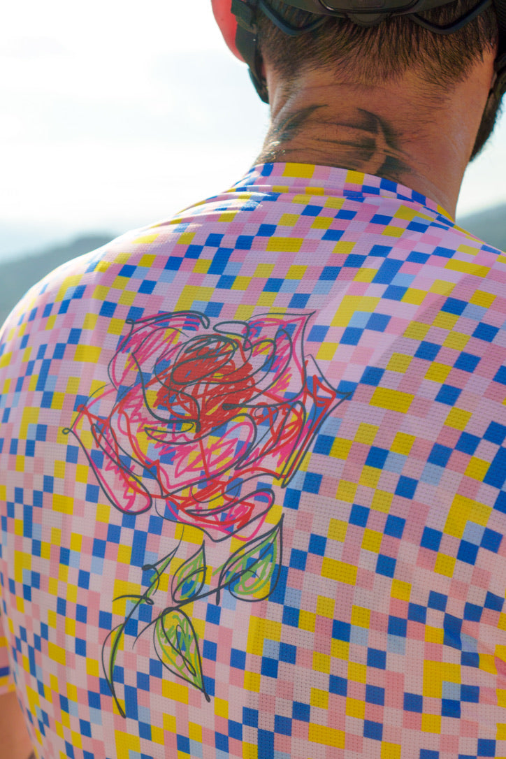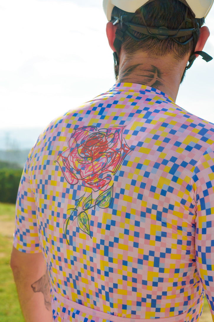The Stickman Cycling Rose Jersey is a celebration of elegance and resilience. Named "Rose," this jersey features a stunning digital rose design set against a backdrop of colorful pixels. The rose symbolizes beauty and strength, making it a perfect motif for cyclists who embody these qualities. Crafted from high-performance fabric, the Rose Jersey offers optimal comfort and breathability, ensuring you stay cool and stylish on every ride. The unique design of the Rose Jersey sets you apart, making a bold statement on the road.