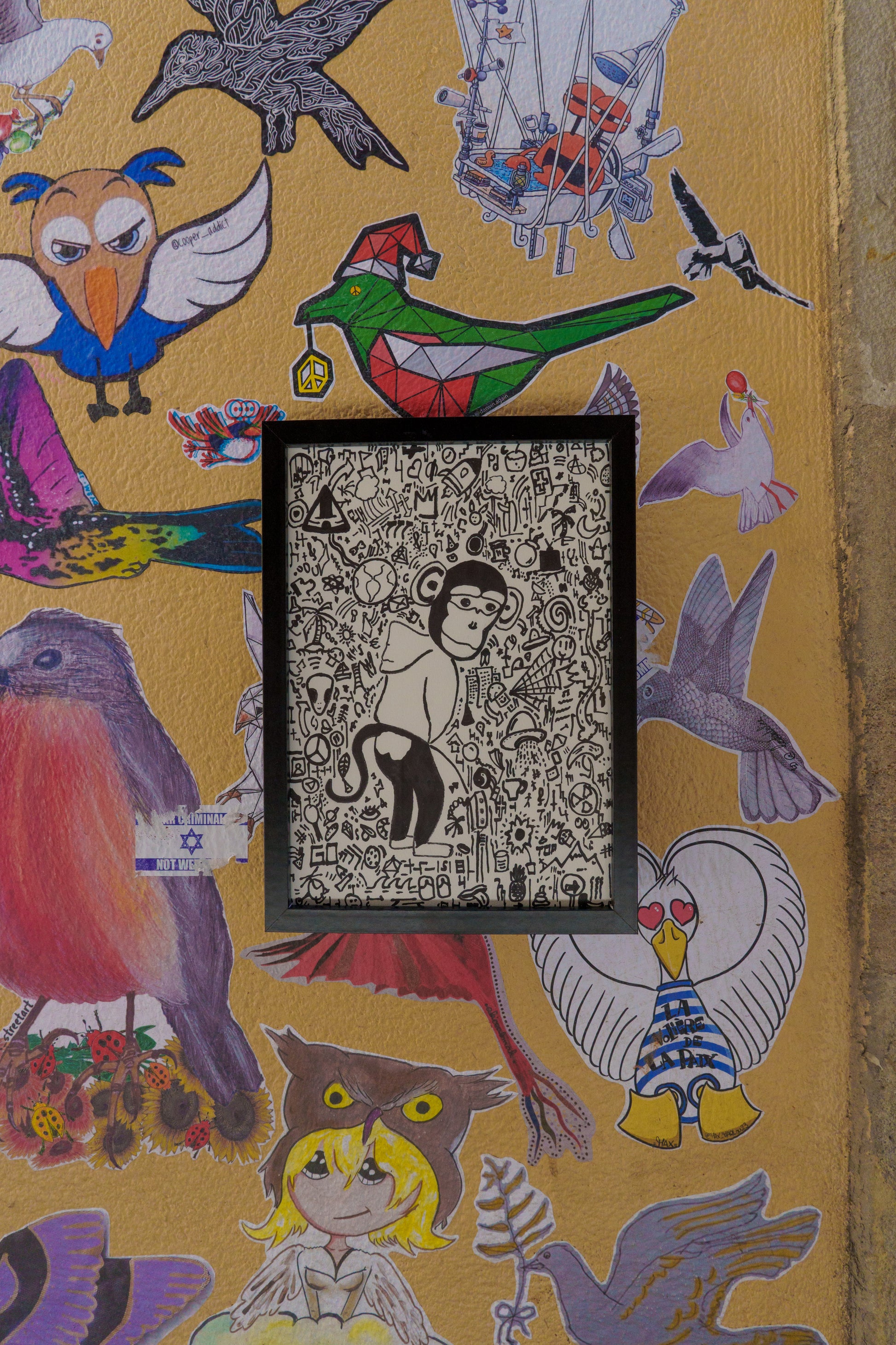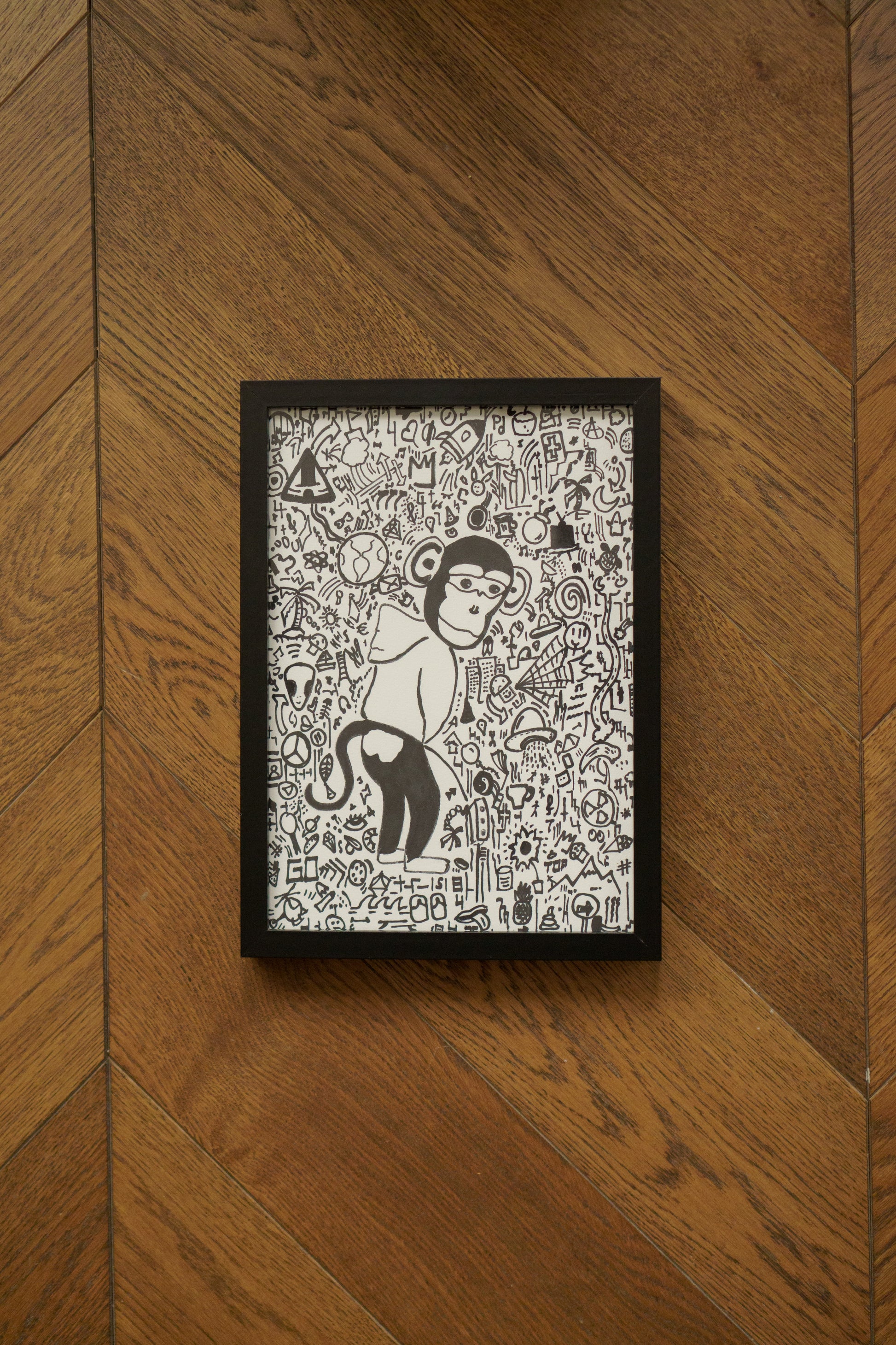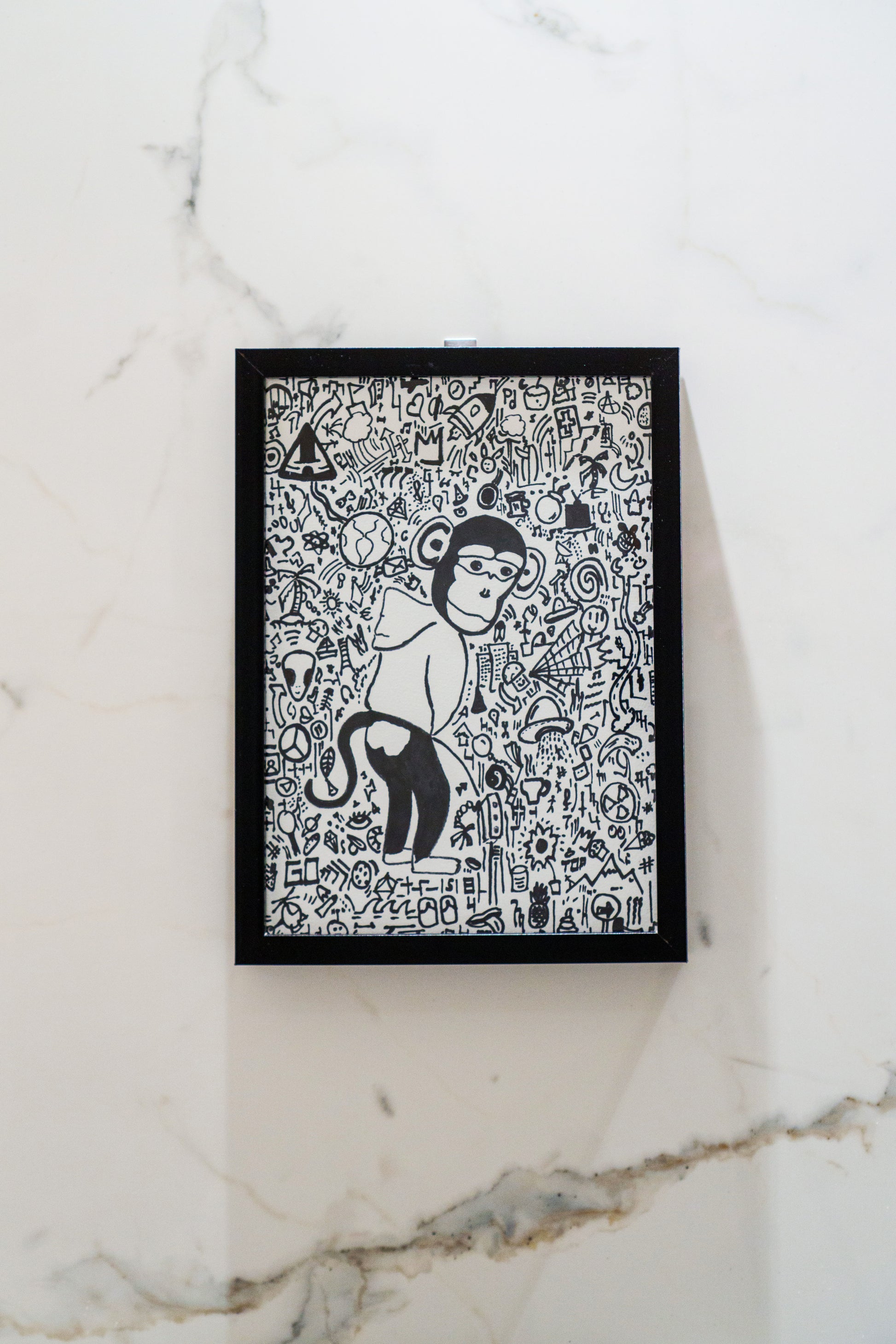 Introducing "Winston" - the spirited simian with a penchant for creativity and a mind as vibrant as his surroundings. Against a backdrop of whimsical black and white doodles, our playful primate friend revels in the boundless expanse of his own imagination.
