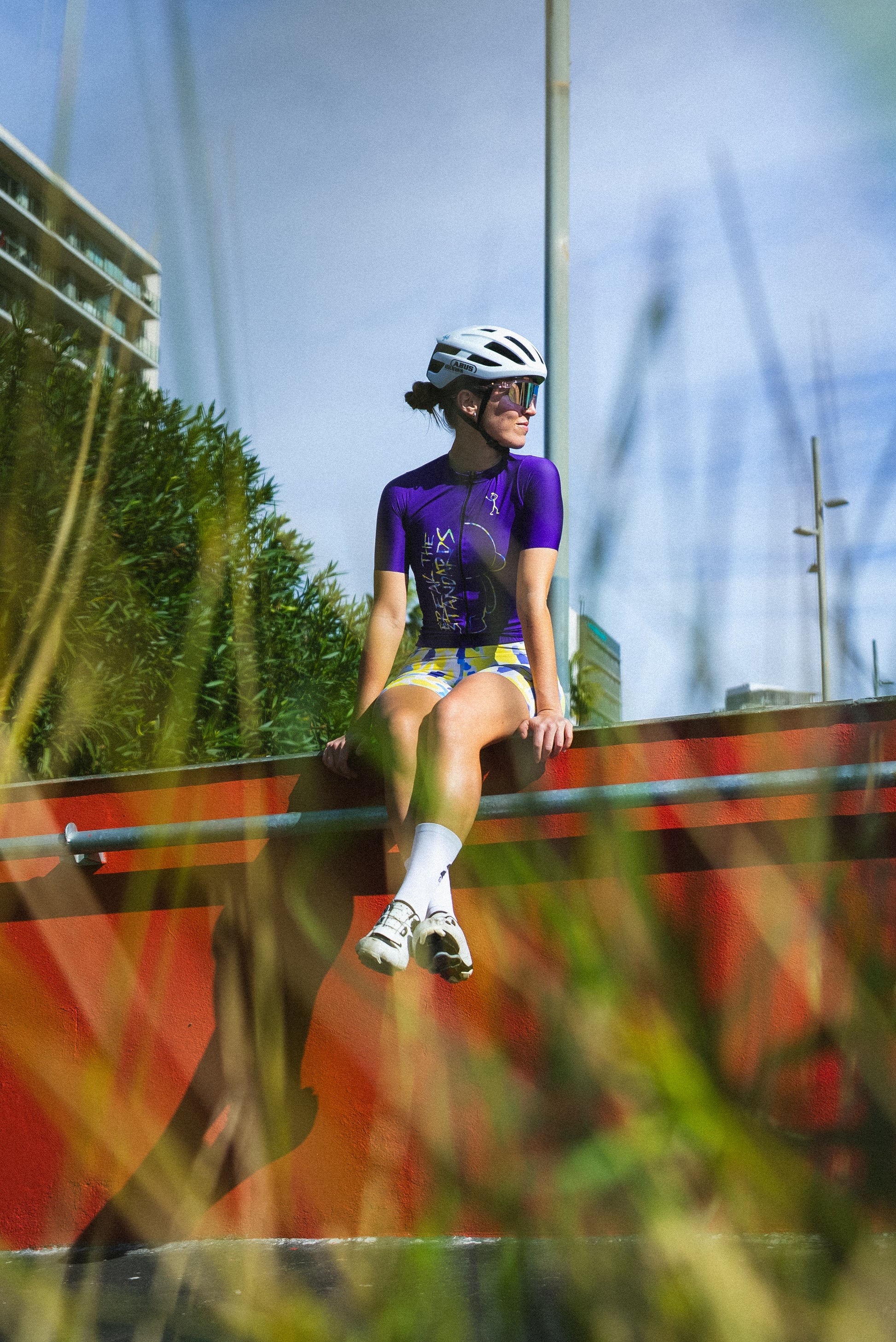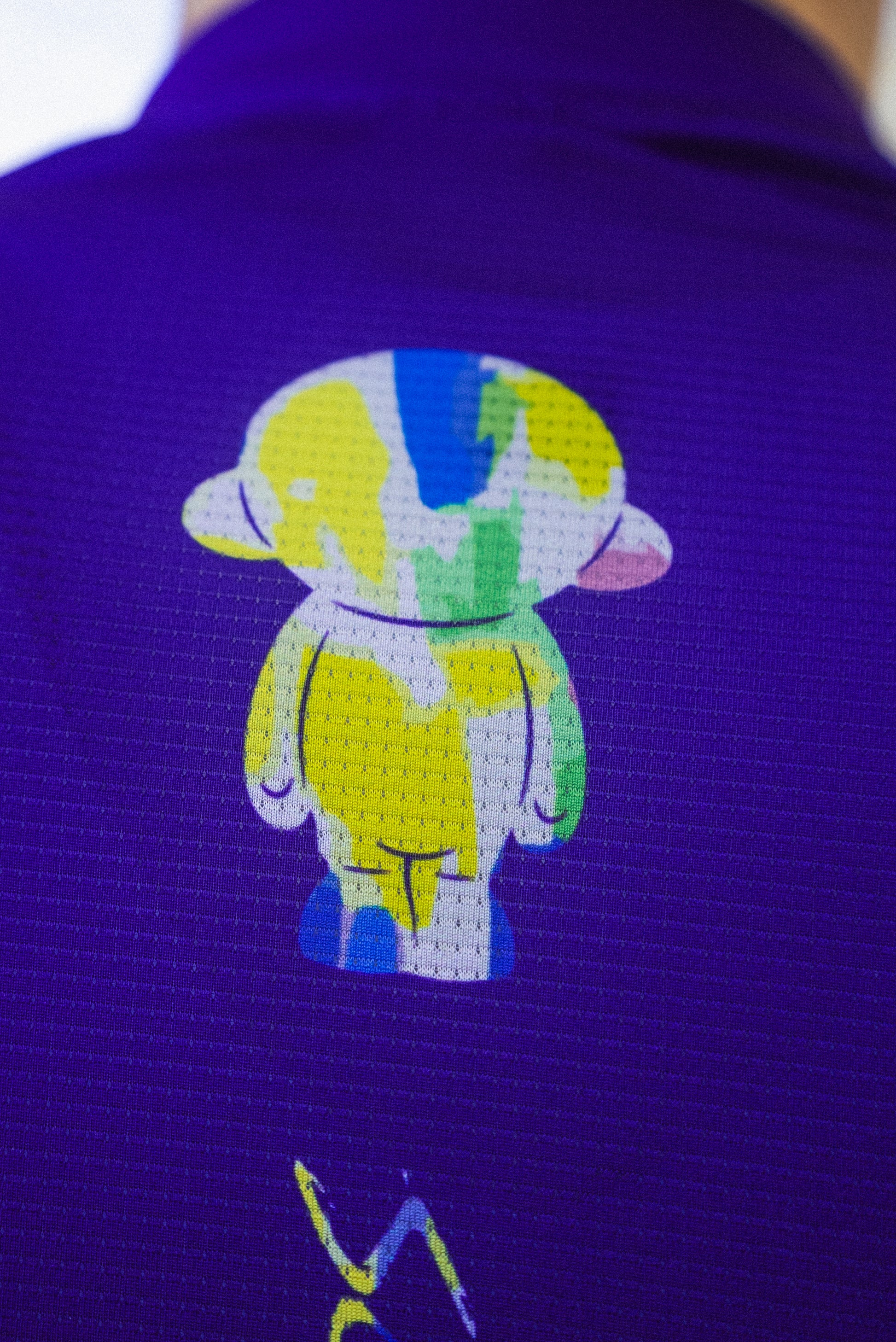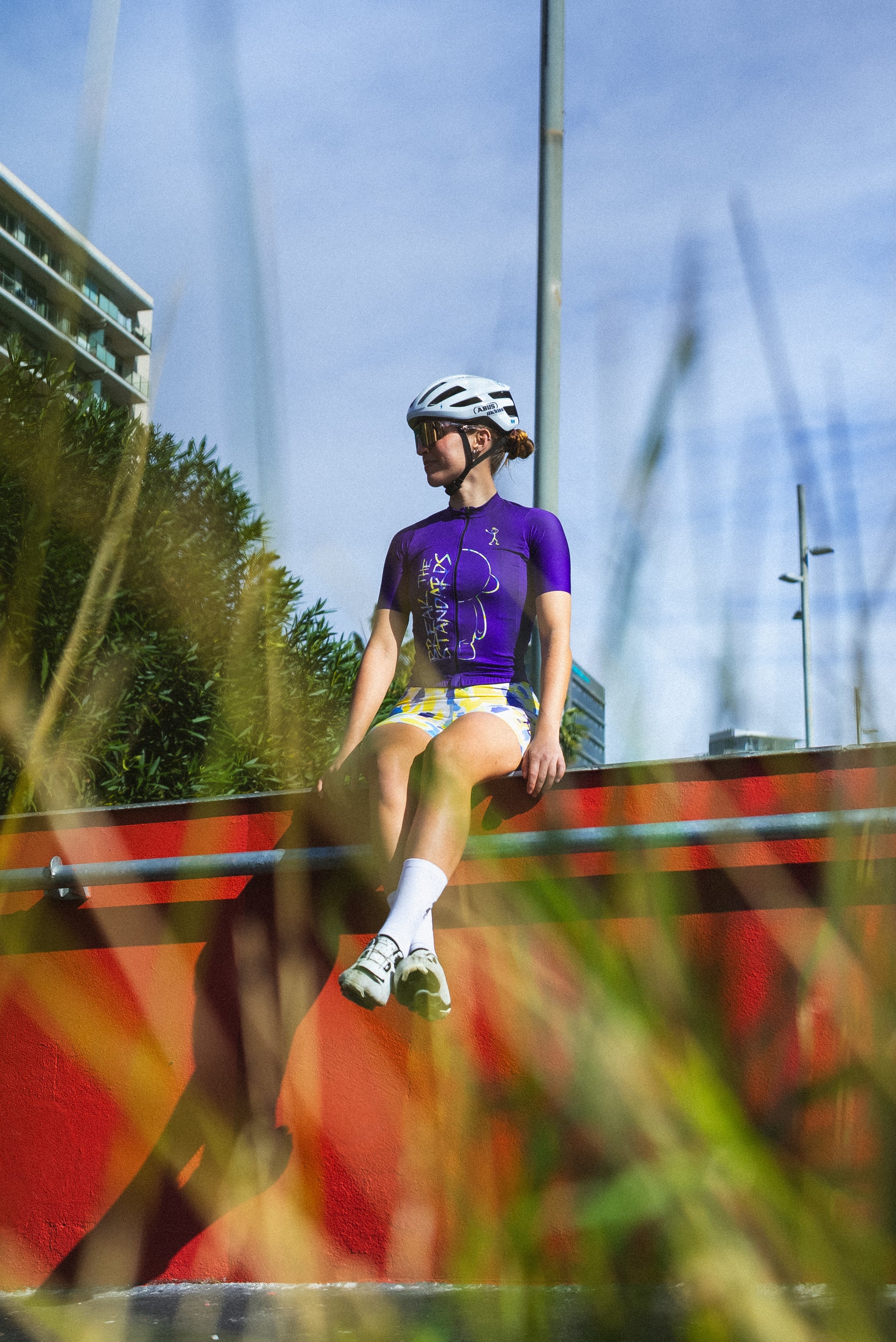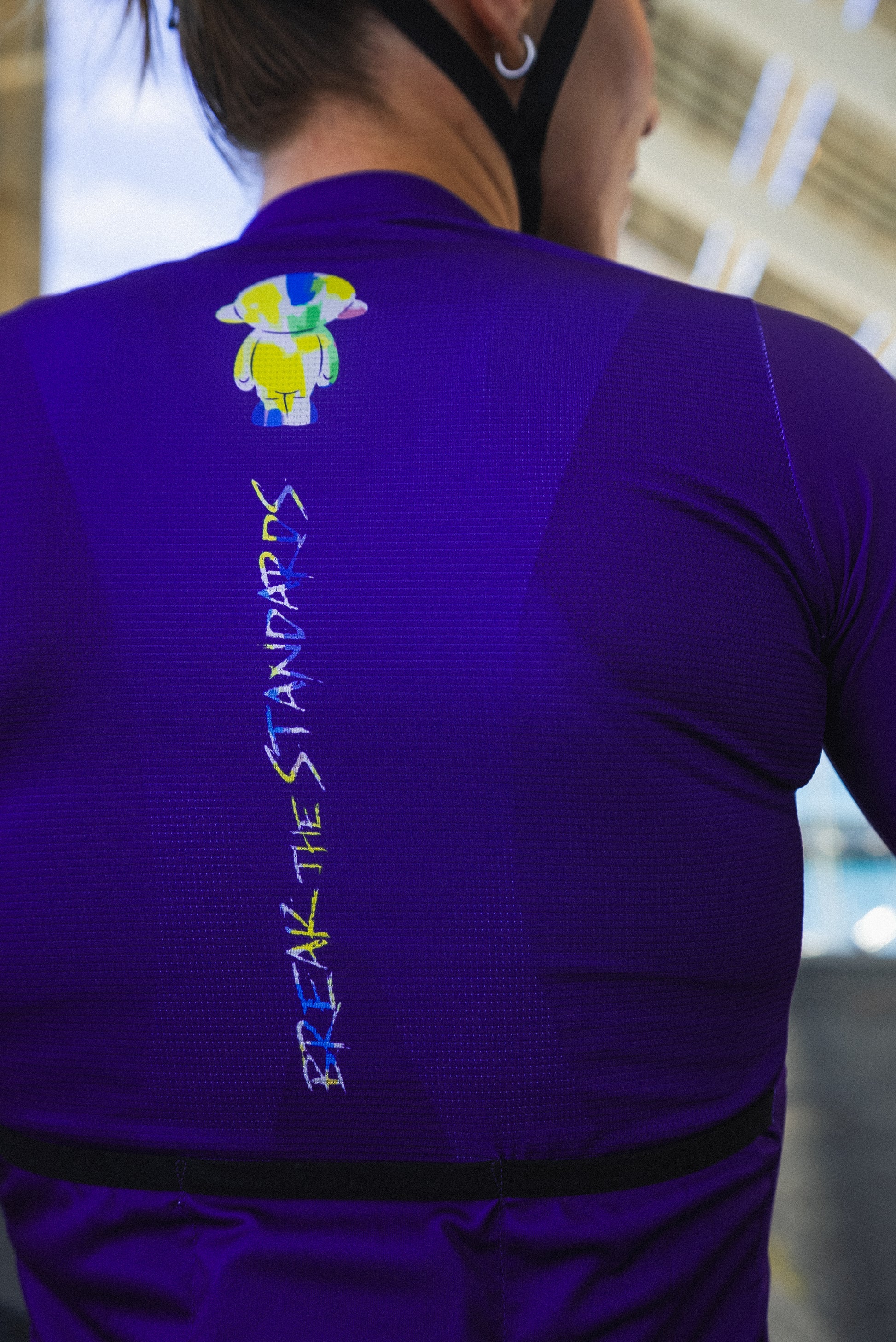 La base en morado intenso le da al maillot una presencia sólida y elegante, mientras que la ilustración gráfica del frente introduce el caos juguetón del concepto Break the Standards. El Stickman característico aparece sutilmente, recordándonos que el ciclismo está hecho para ser expresivo, divertido y un poco rebelde.
