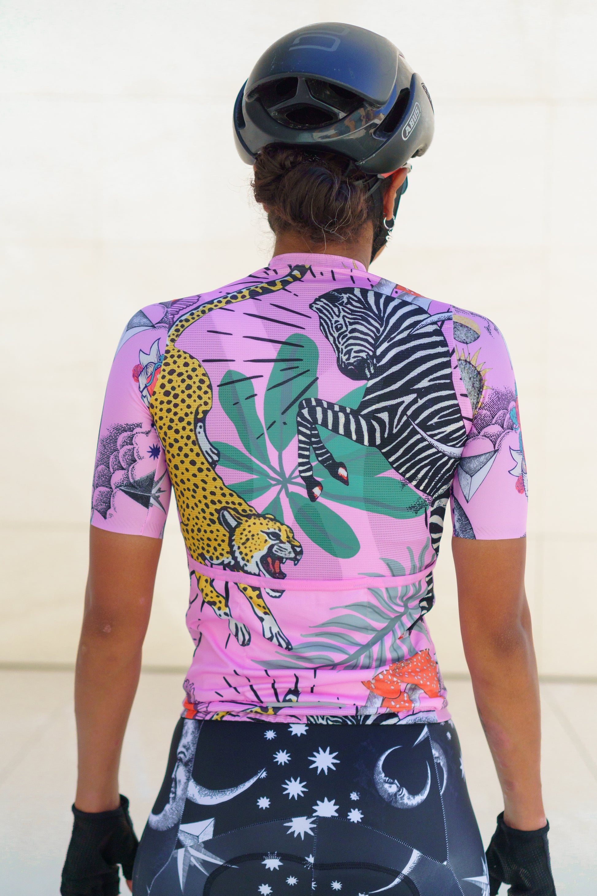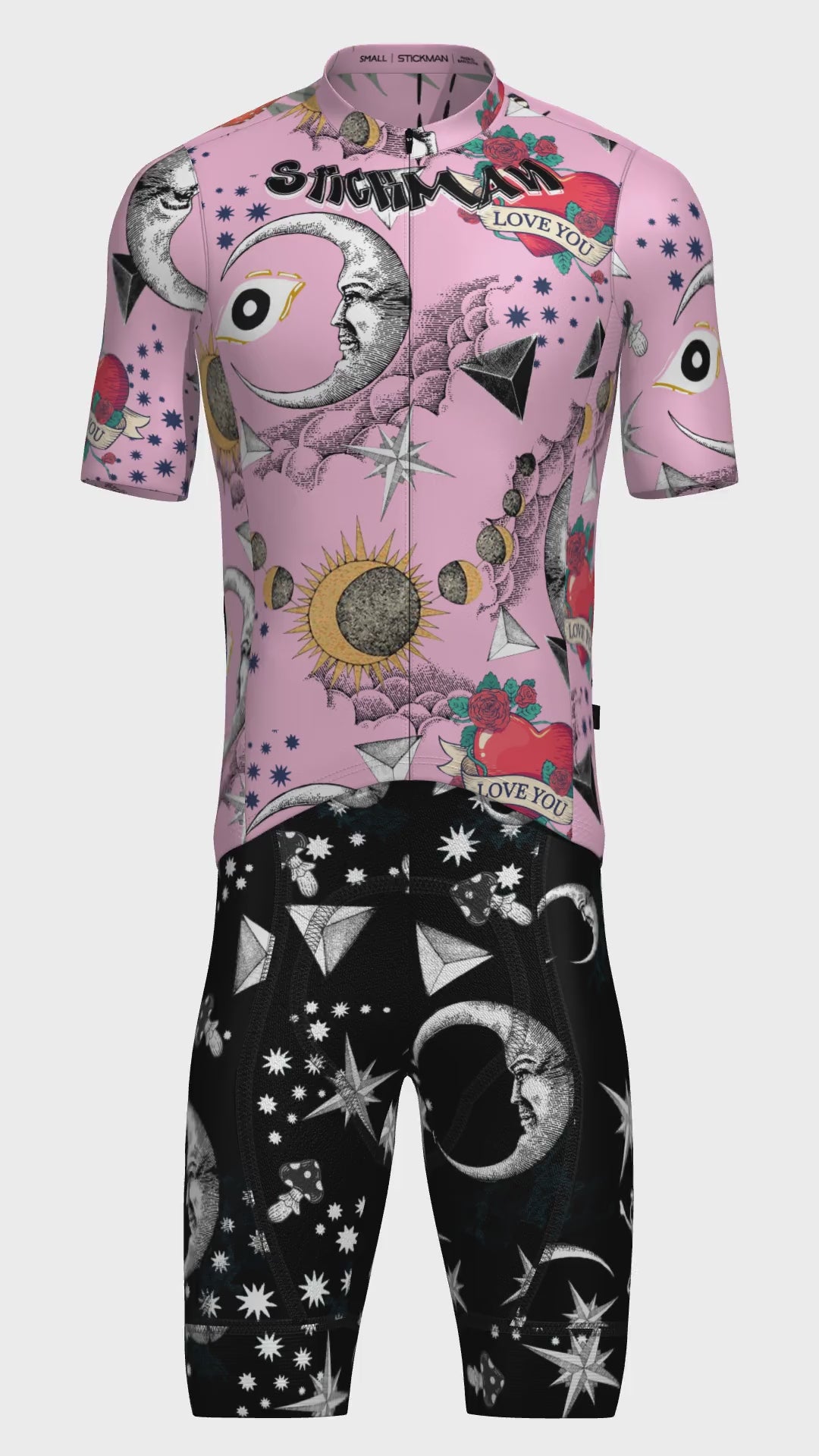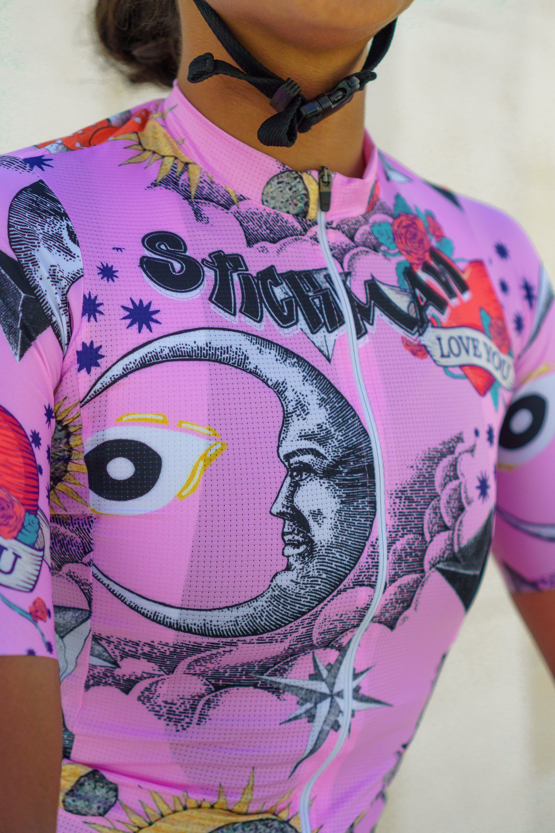 スティックマンの「ドリーム」ジャージをご紹介します-想像力が飛翔する場所。このピンクのジャージは、夢のキャンバスであり、月や星の幻想的な落書きで飾られ、空気感を創り出しています。背面には、強烈なシーンが広がっています:激しい虎と不屈のシマウマが象徴的な戦いを繰り広げています。このアートワークは、二重の強さの本質を捉えています-夢を追い求める猛烈な決意と、挑戦に果敢に立ち向かう不屈の勇気。虎の精神とシマウマの強靭さとともに、ドリームジャージの魅惑的なオーラに包まれて乗りましょう。スティックマンスタイルの夢のような美しさで旅を楽しんでください。