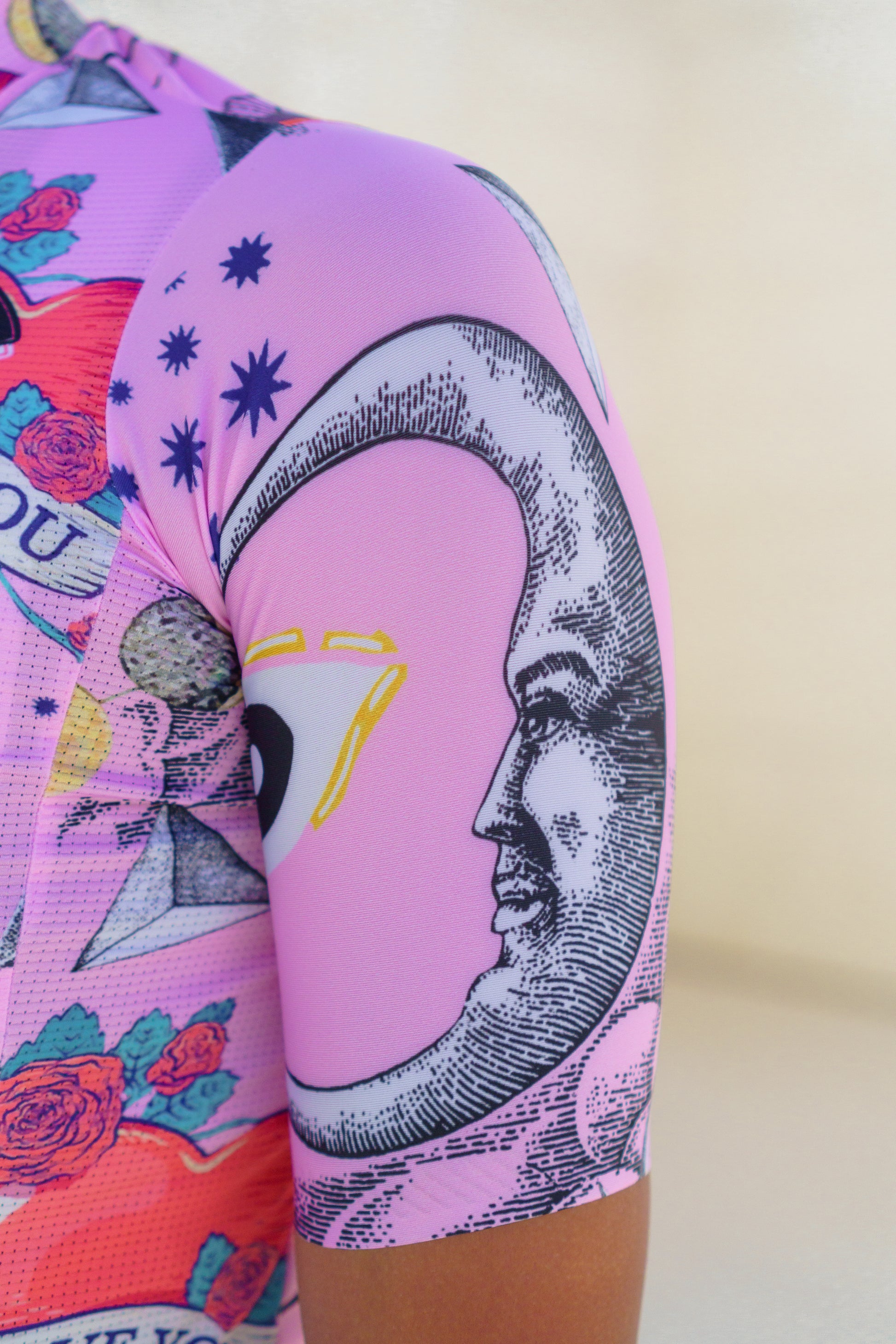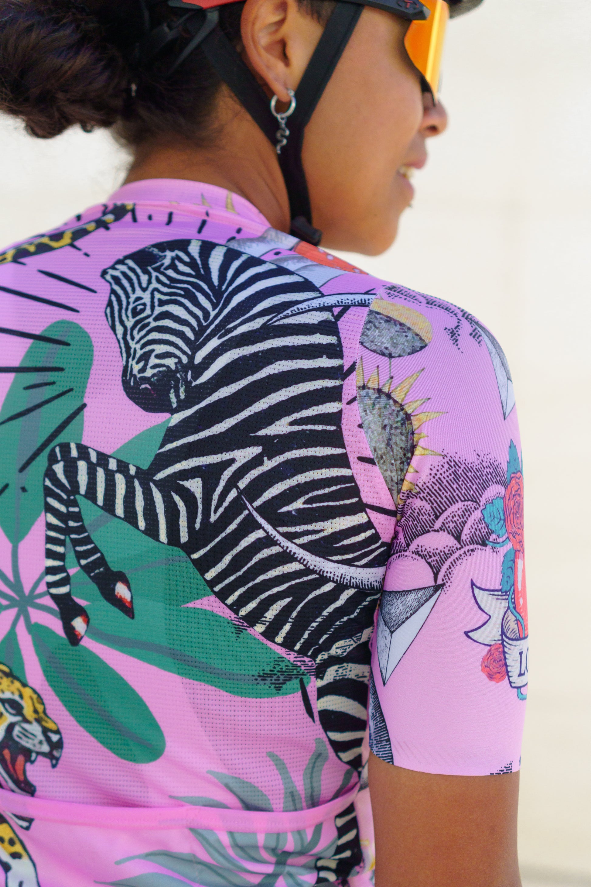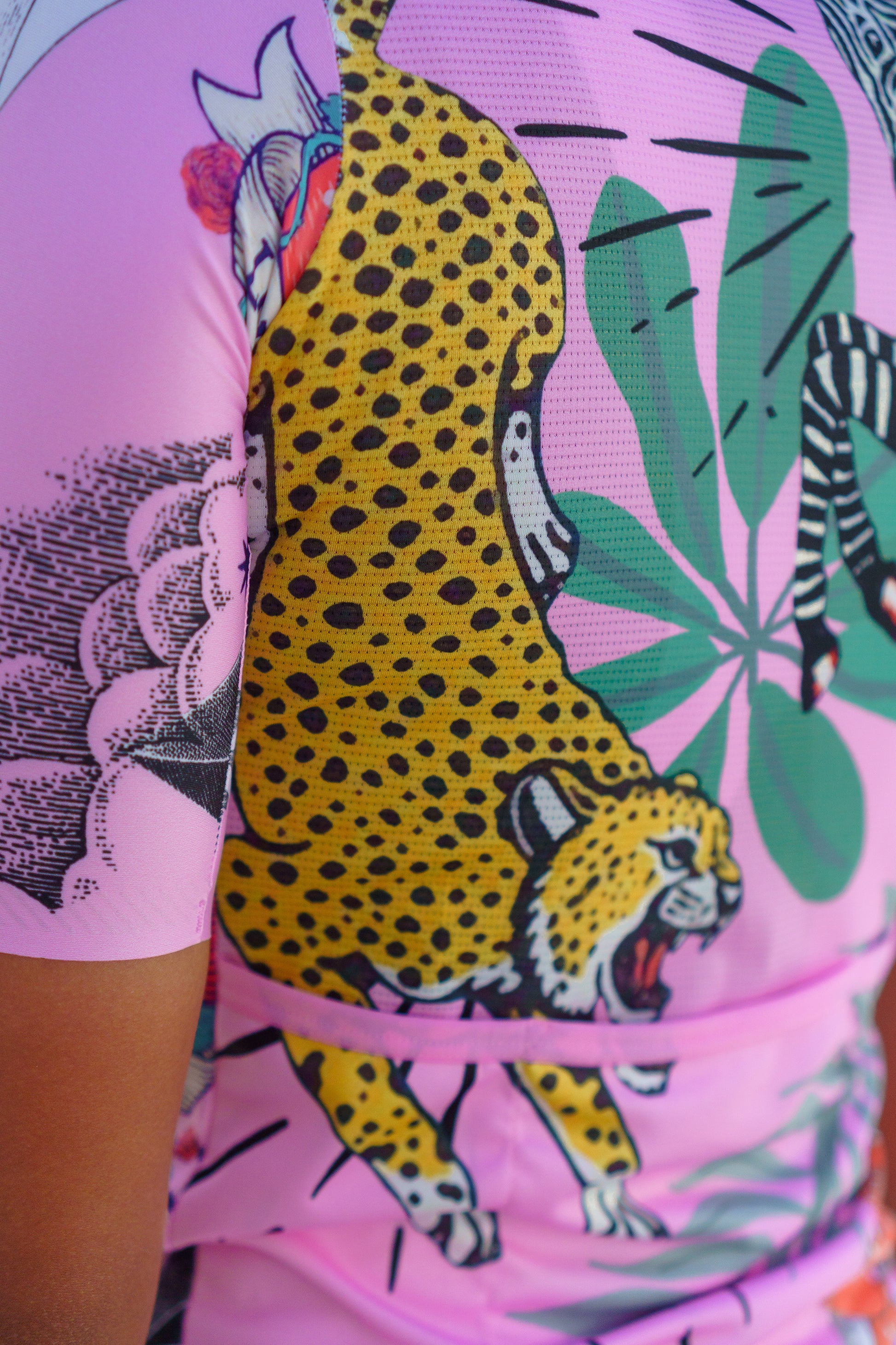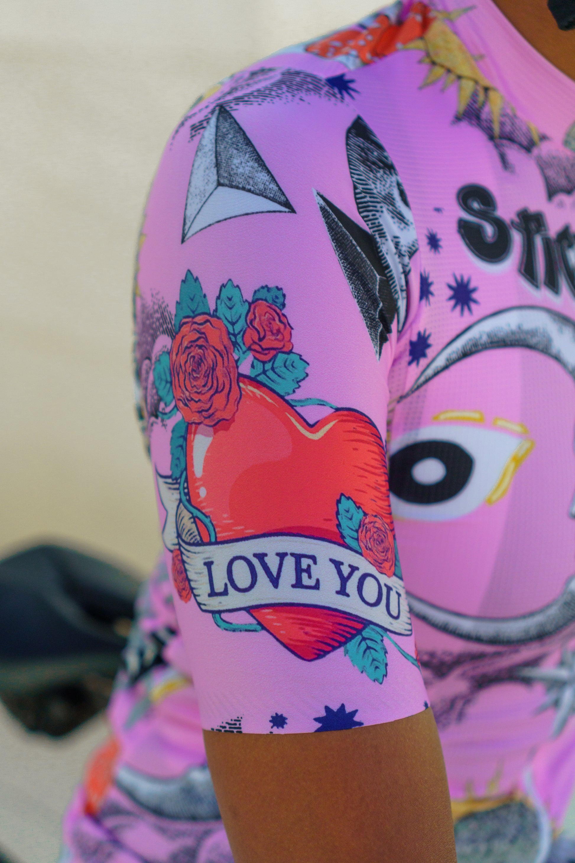 スティックマンの「ドリーム」ジャージをご紹介します-想像力が飛翔する場所。このピンクのジャージは、夢のキャンバスであり、月や星の幻想的な落書きで飾られ、空気感を創り出しています。背面には、強烈なシーンが広がっています:激しい虎と不屈のシマウマが象徴的な戦いを繰り広げています。このアートワークは、二重の強さの本質を捉えています-夢を追い求める猛烈な決意と、挑戦に果敢に立ち向かう不屈の勇気。虎の精神とシマウマの強靭さとともに、ドリームジャージの魅惑的なオーラに包まれて乗りましょう。スティックマンスタイルの夢のような美しさで旅を楽しんでください。