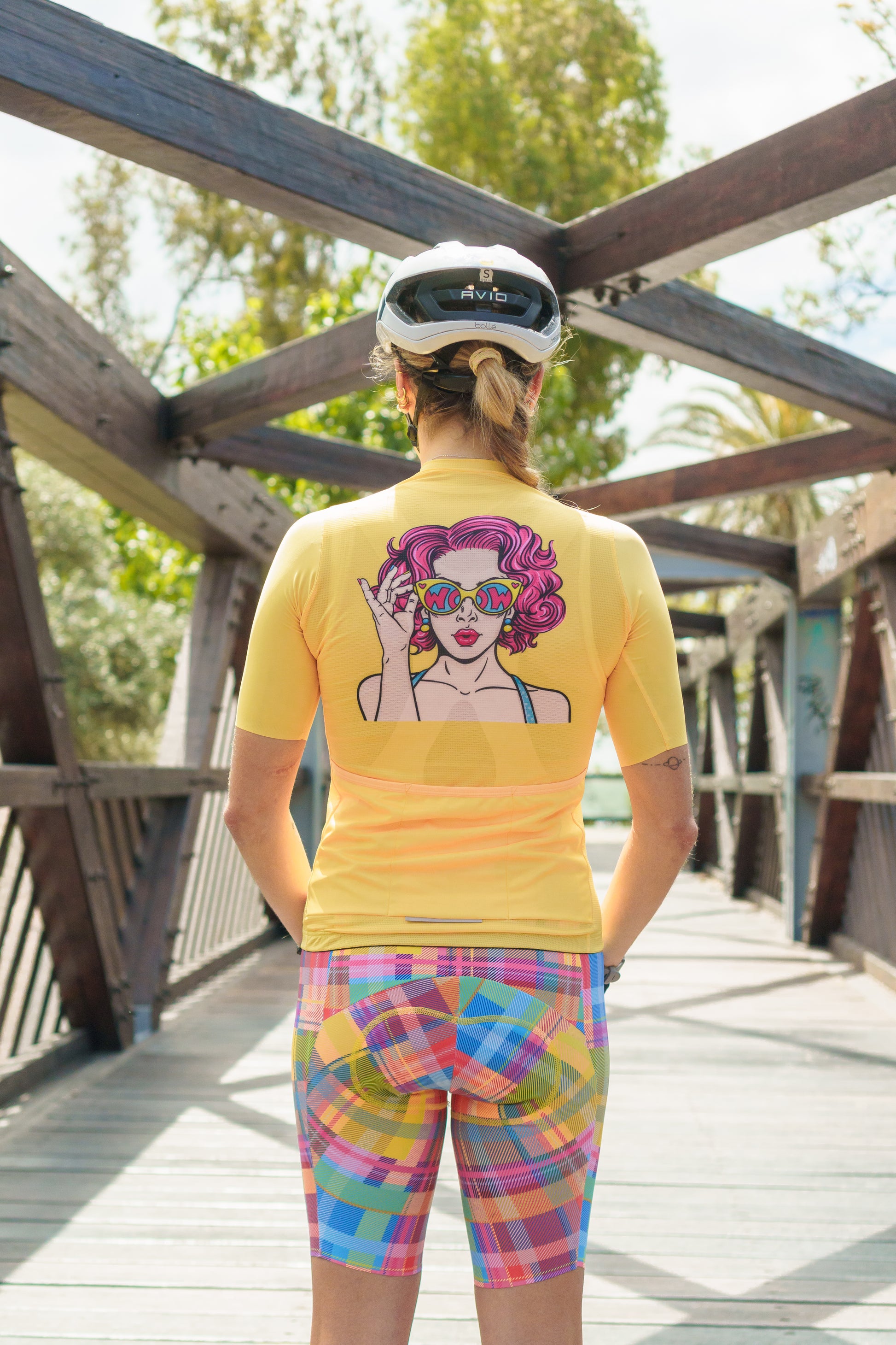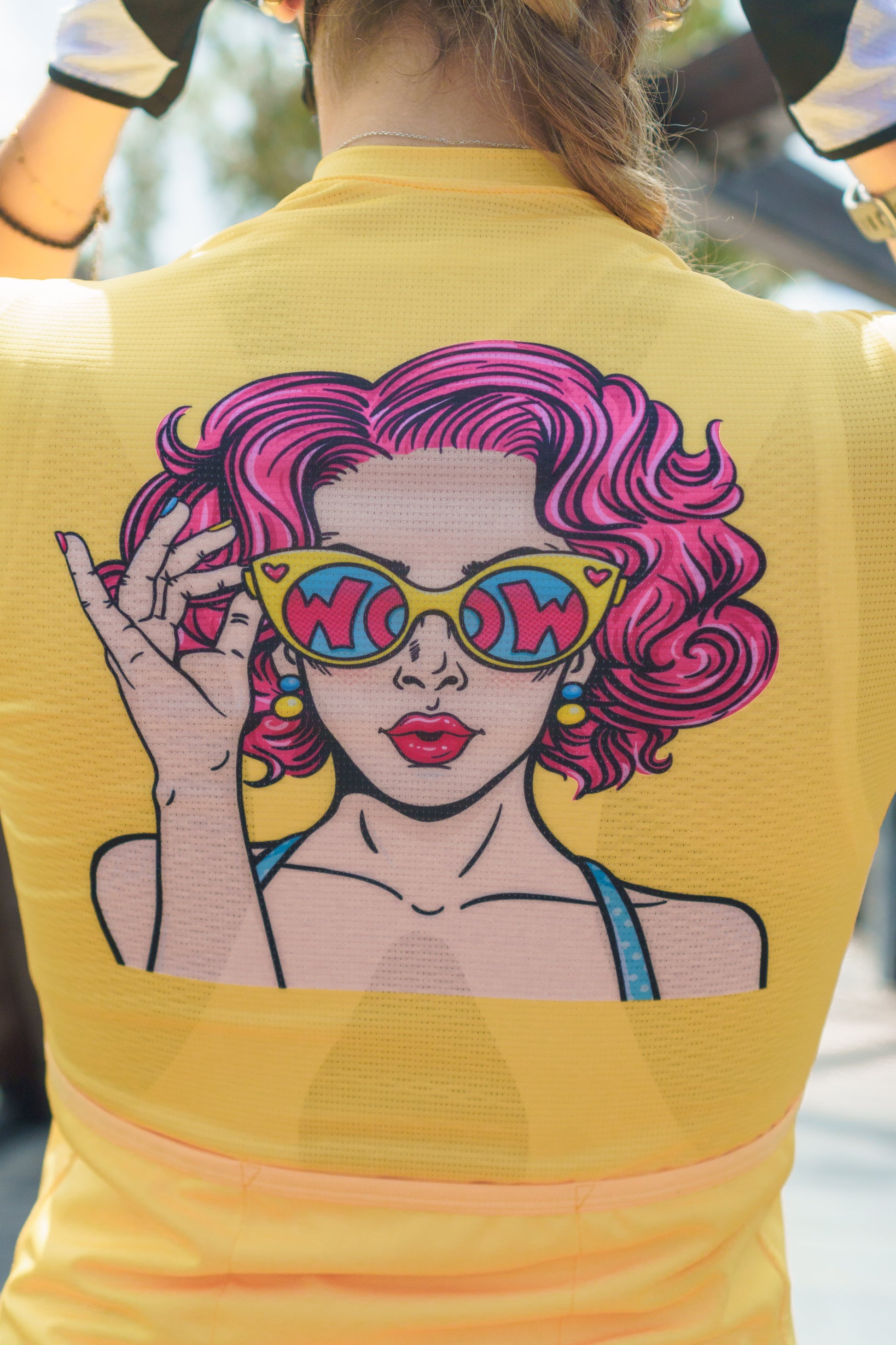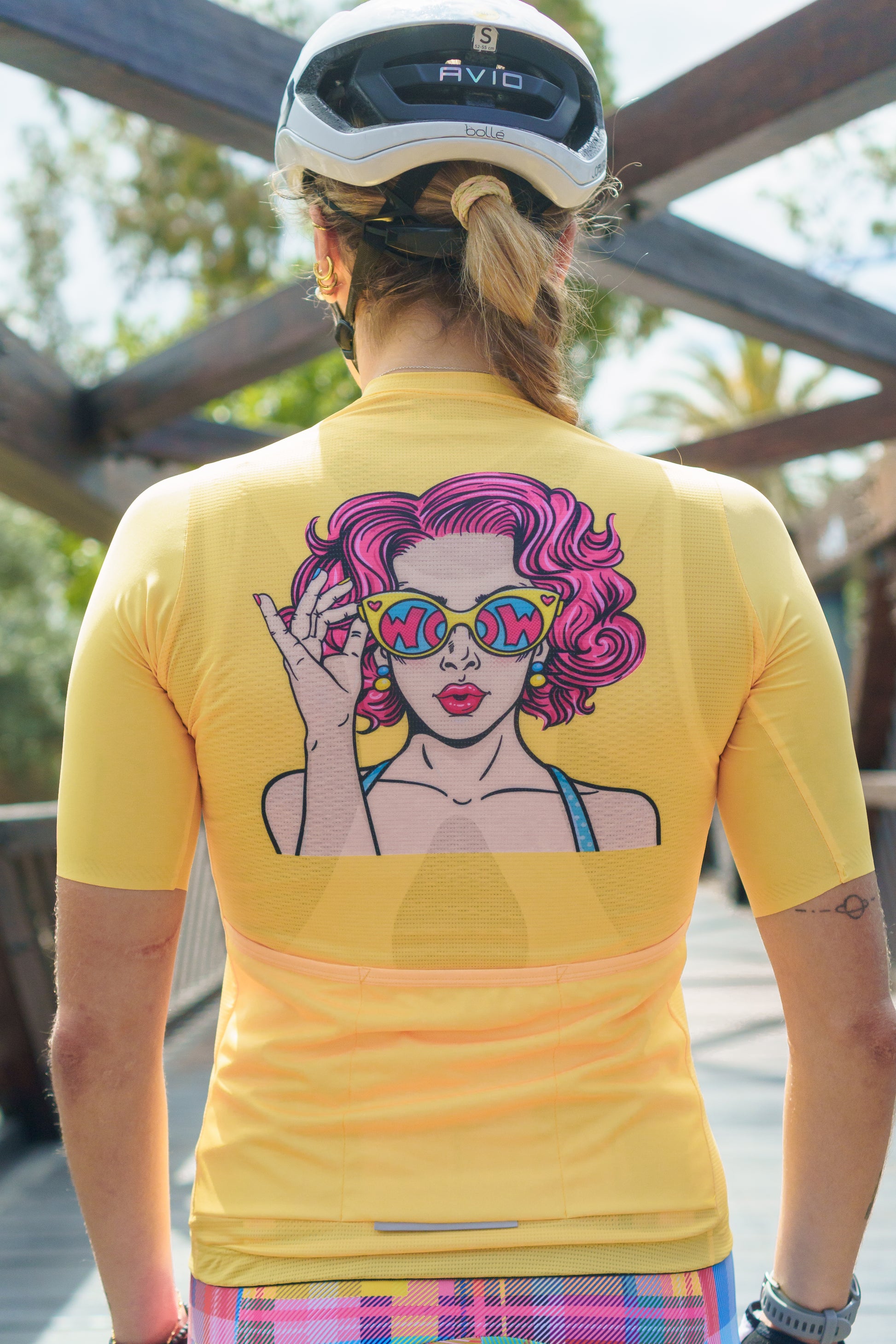 コミックオリジナルジャージのご紹介 – サイクリングファッションの世界での大胆な声明。この目を引く黄色のジャージは、シックな眼鏡をかけた女性の顔が描かれた鮮やかなデザインで、背面には「WOW」という言葉が誇らしげに表示されています。このデザインは、コミックブックアートの本質を捉え、遊び心のあるポップアート要素と whimsical な楽しさを融合させています。