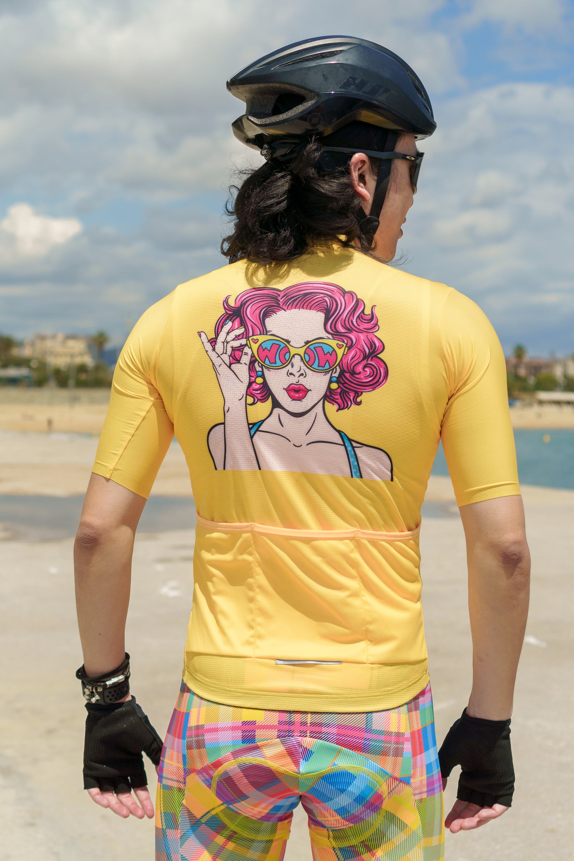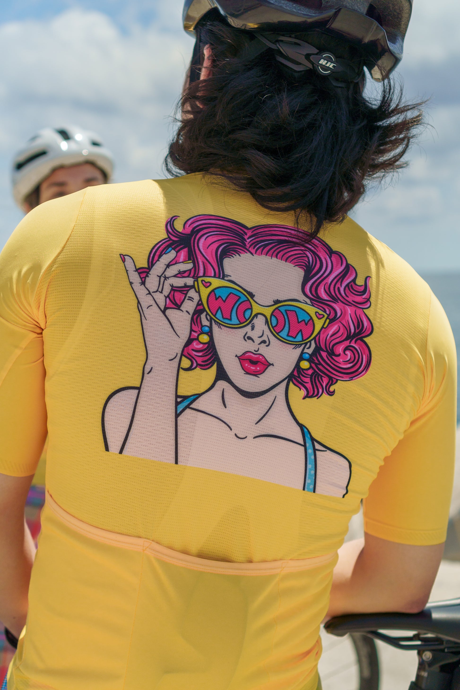 コミックオリジナルジャージのご紹介 – サイクリングファッションの世界での大胆な声明。この目を引く黄色のジャージは、シックな眼鏡をかけた女性の顔が描かれた鮮やかなデザインで、背面には「WOW」という言葉が誇らしげに表示されています。このデザインは、コミックブックアートの本質を捉え、遊び心のあるポップアート要素と whimsical な楽しさを融合させています。