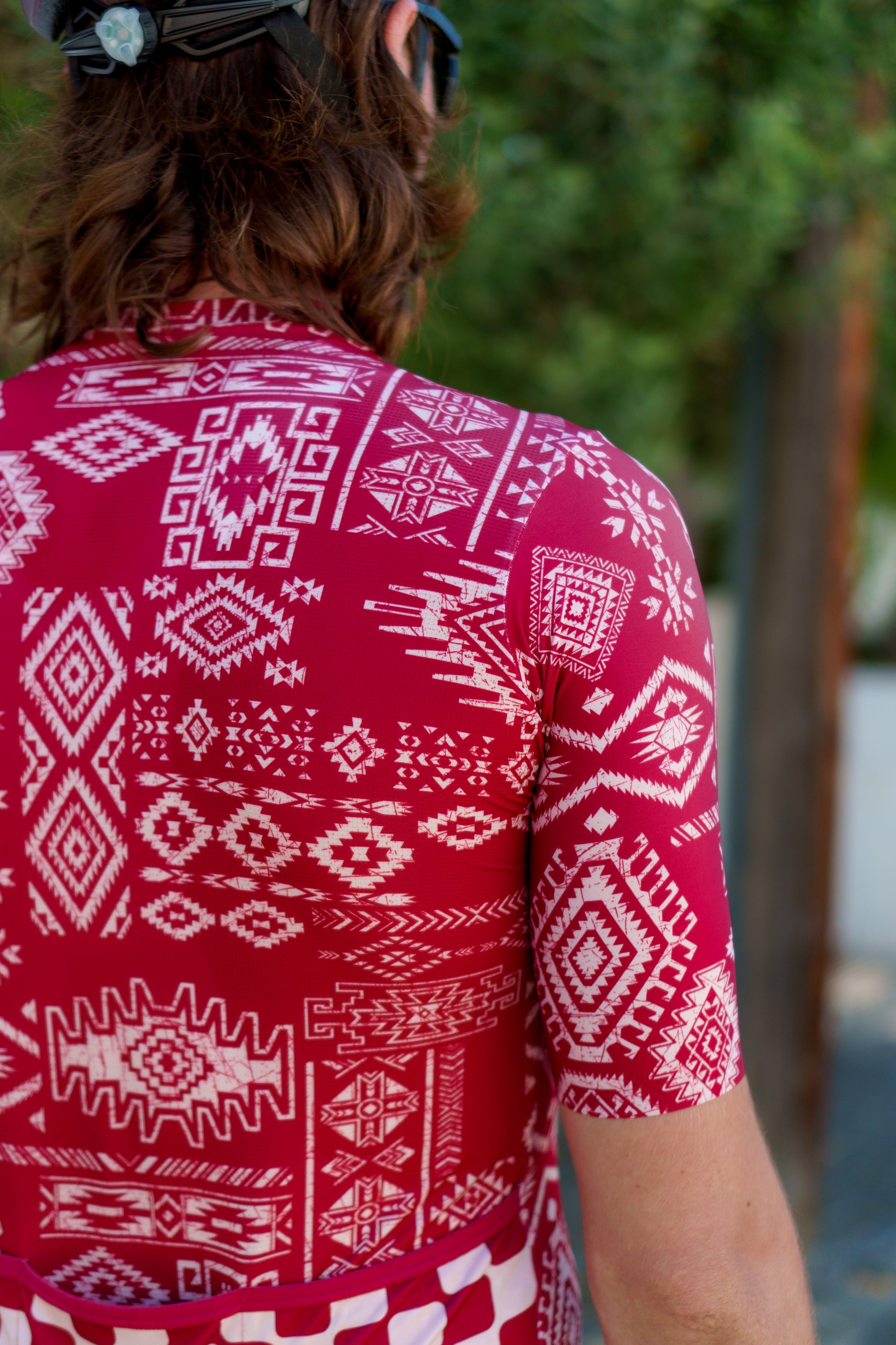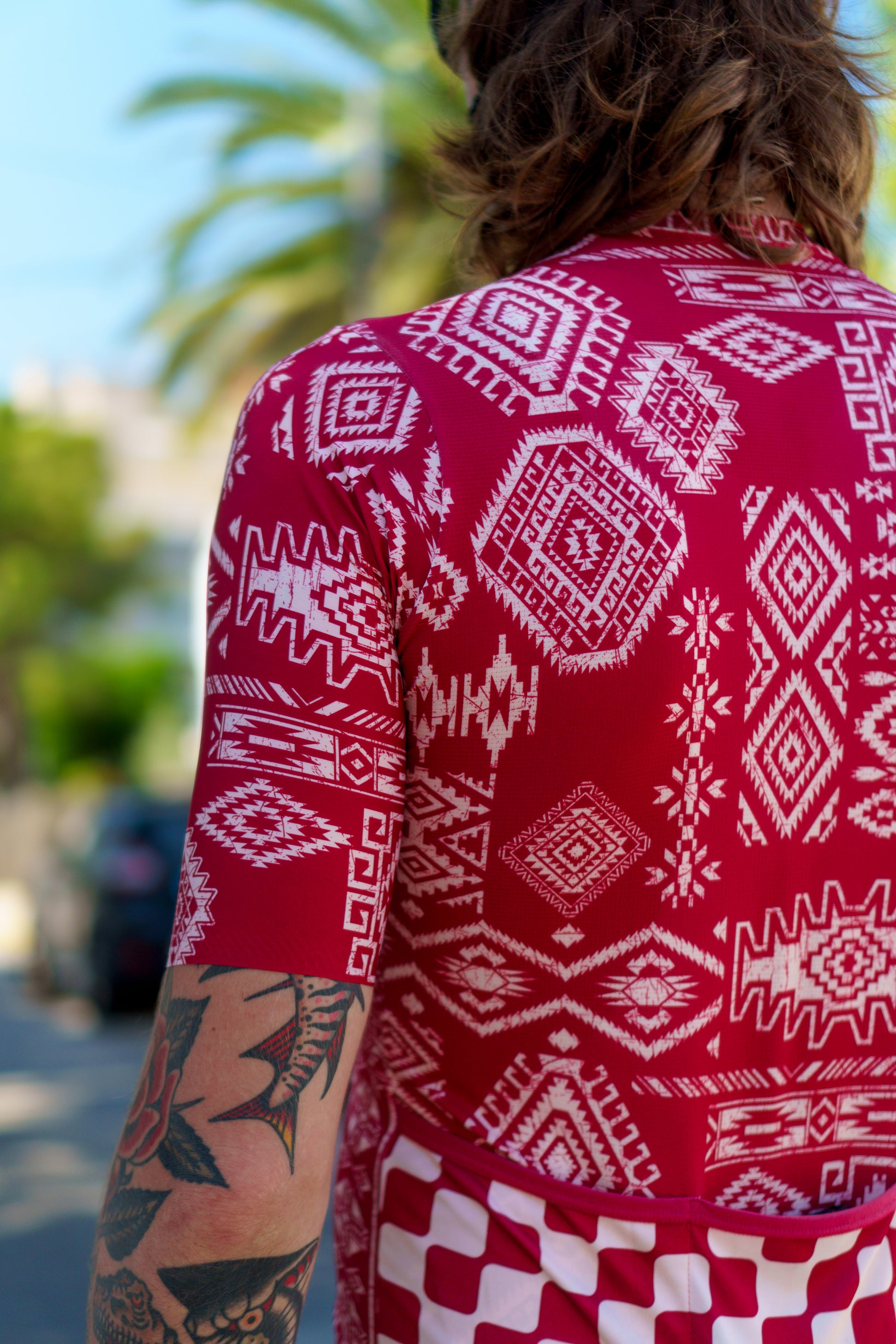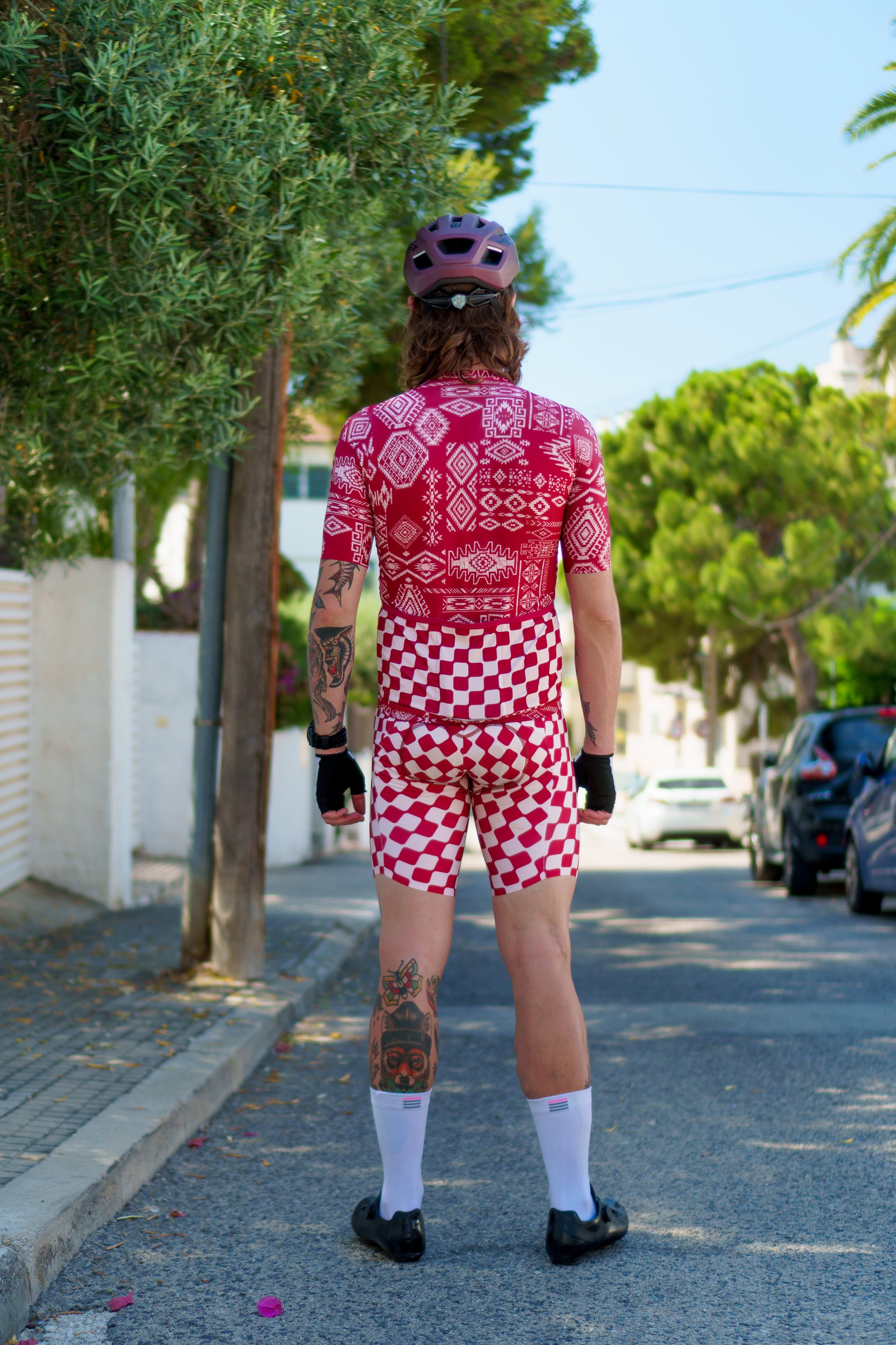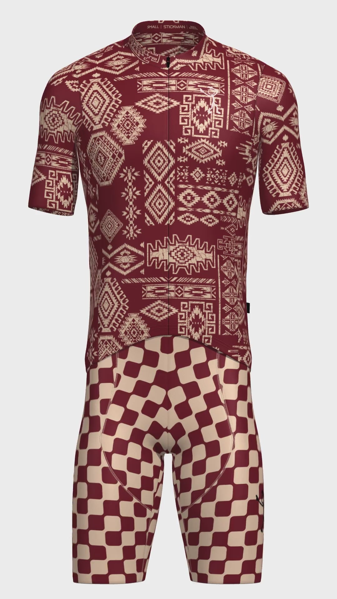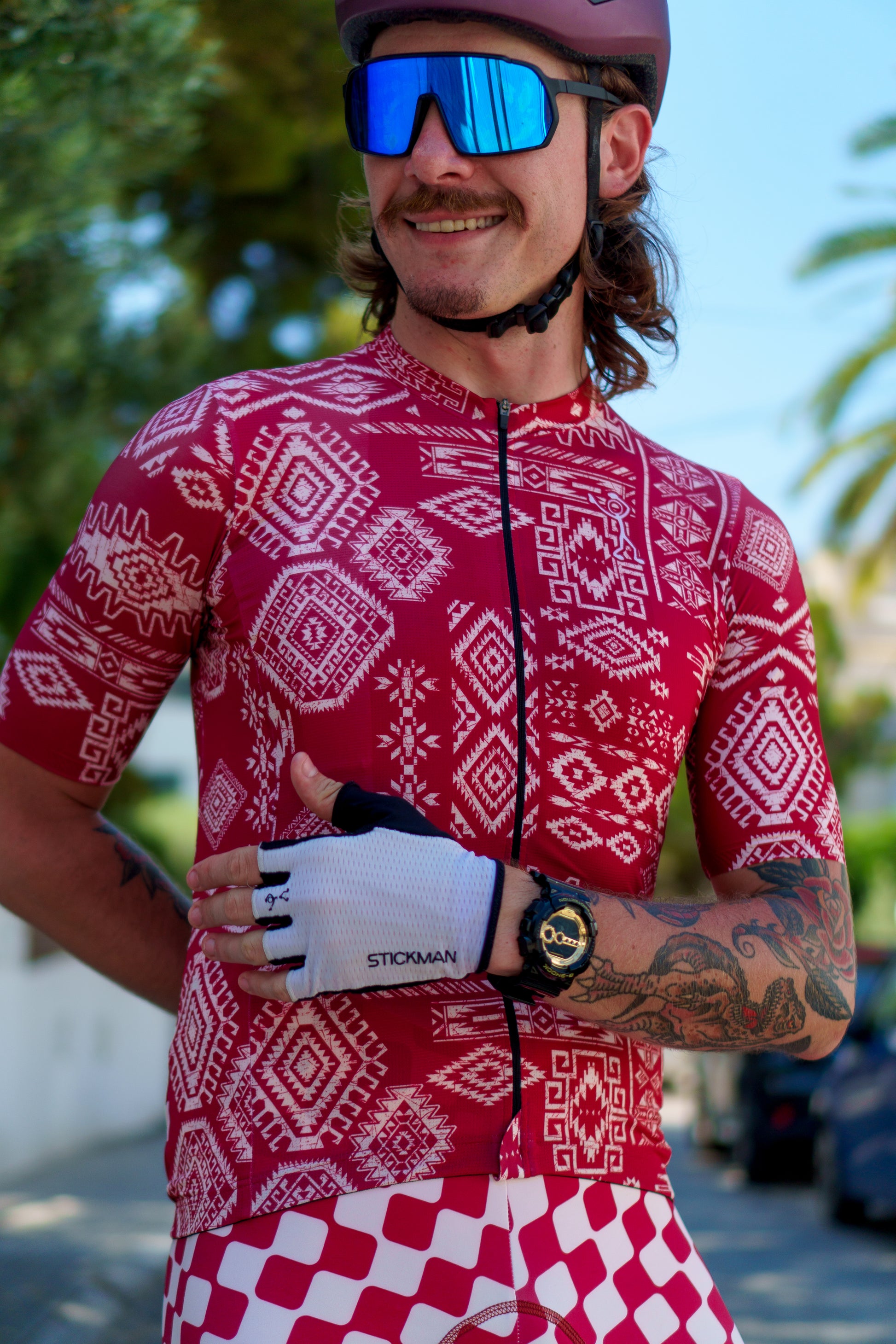 Stickman Sleek Kitをご紹介します - 大胆なパターンと比類のないパフォーマンスが融合したアイテムです。この目を引くアンサンブルは、派手な赤と白のデザインに入り組んだ幾何学的なモチーフが特徴で、スタイルと道路上での存在感の両方で主張します。ジャージは伝統的なパターンとモダンなアレンジの調和が見事に表現されており、ビブは目を引くチェッカーボード柄でそのルックスを引き立てます。