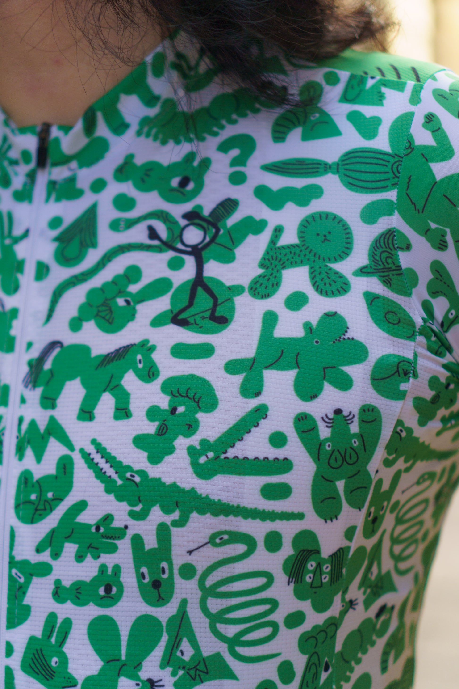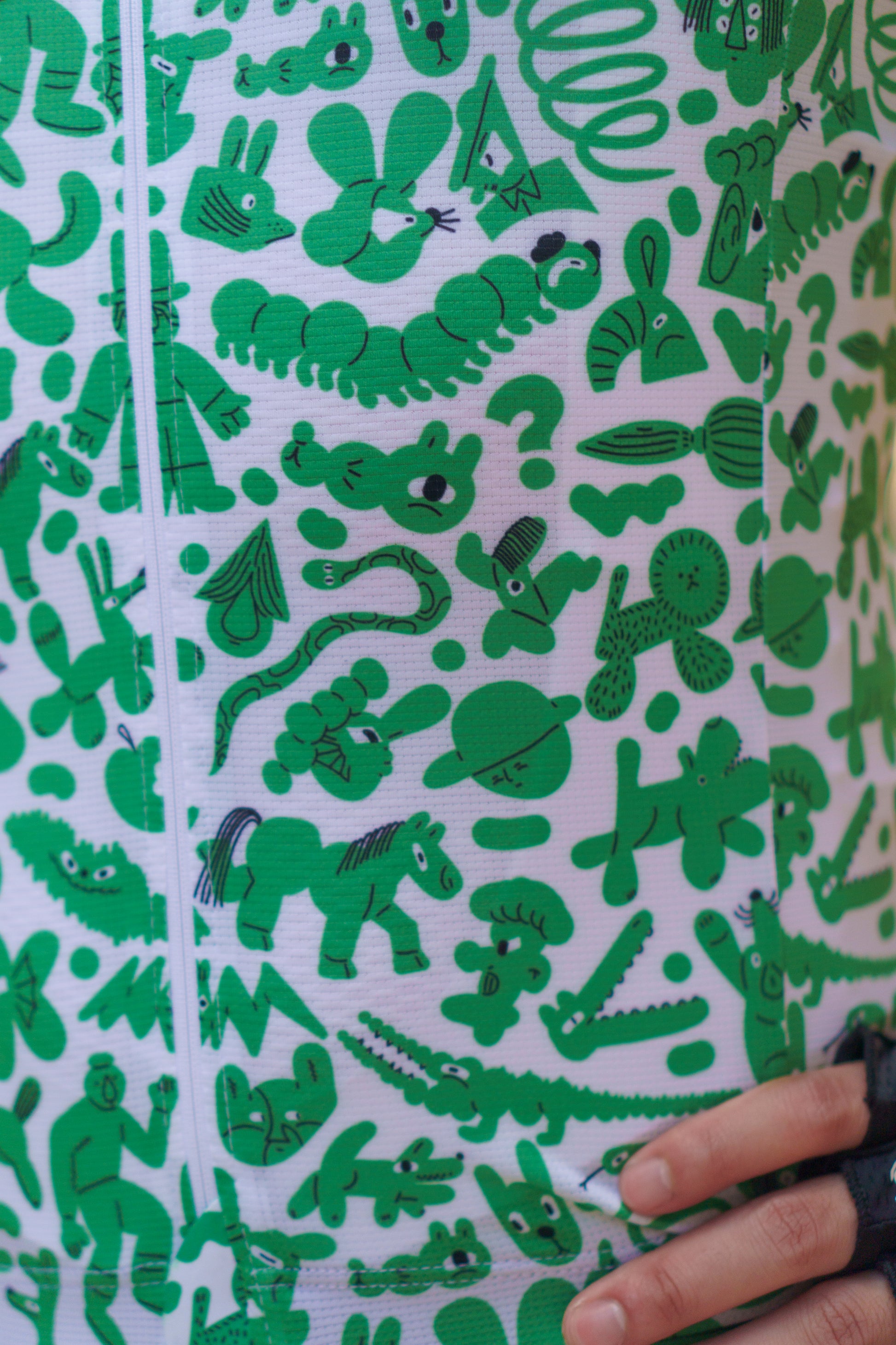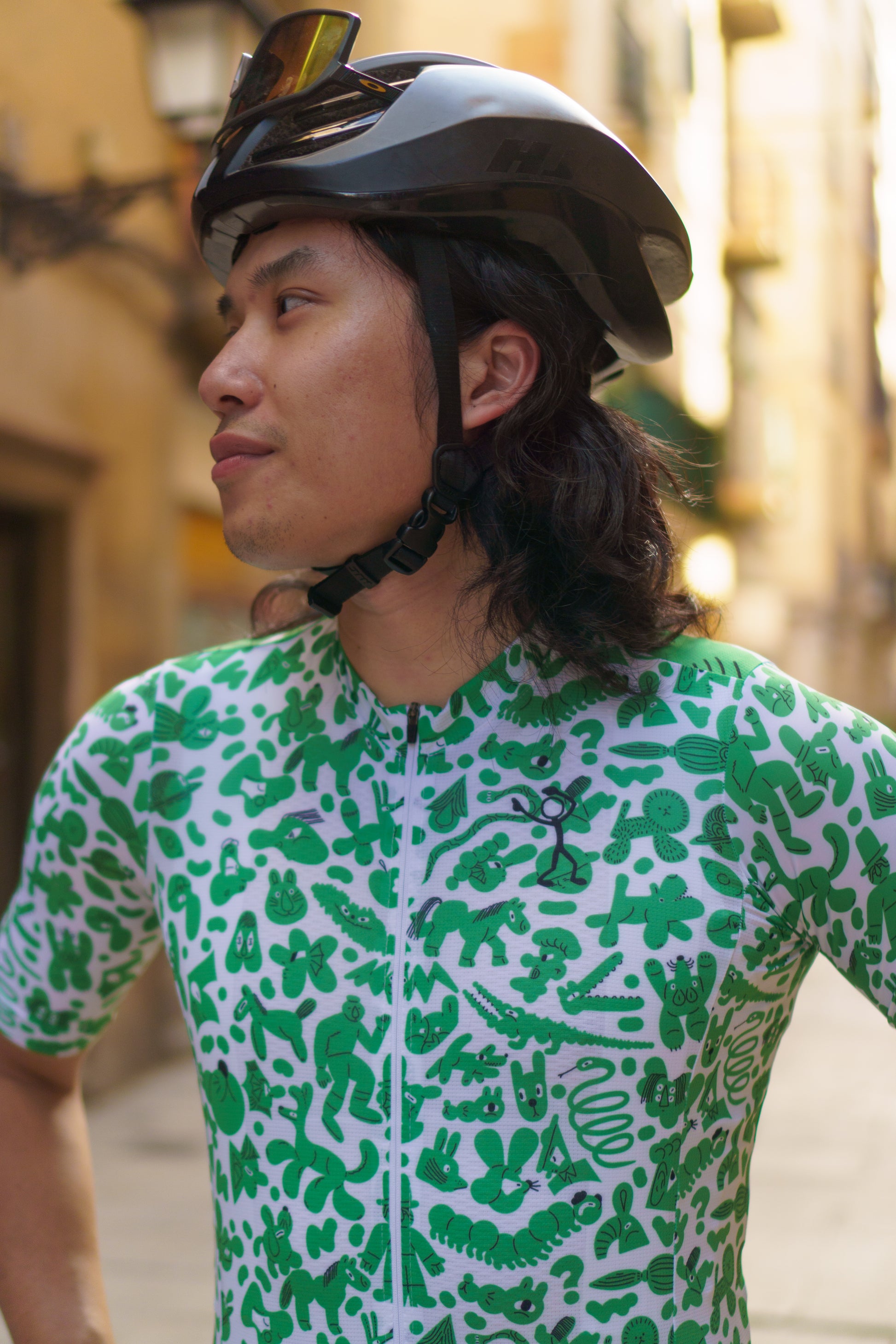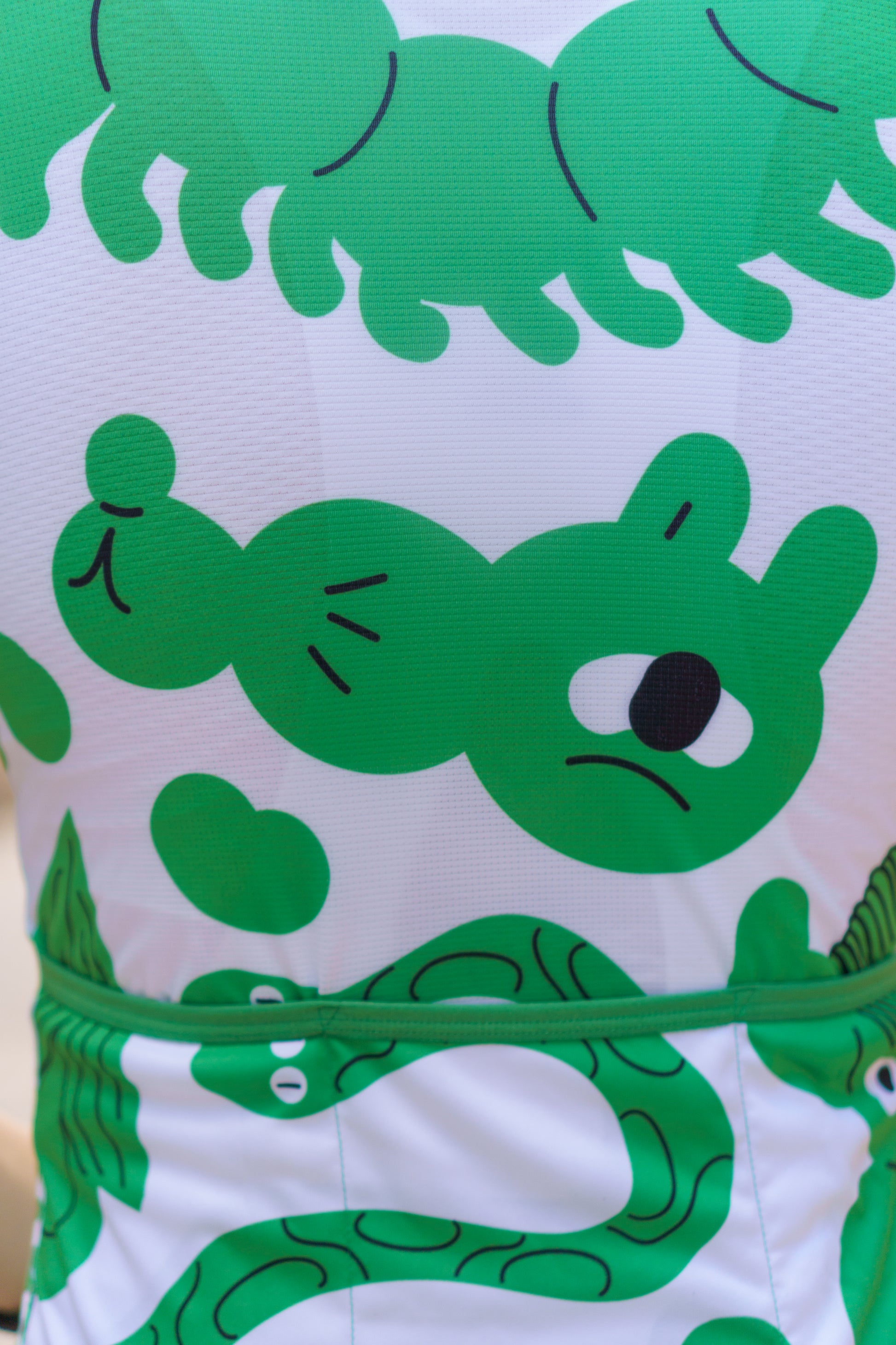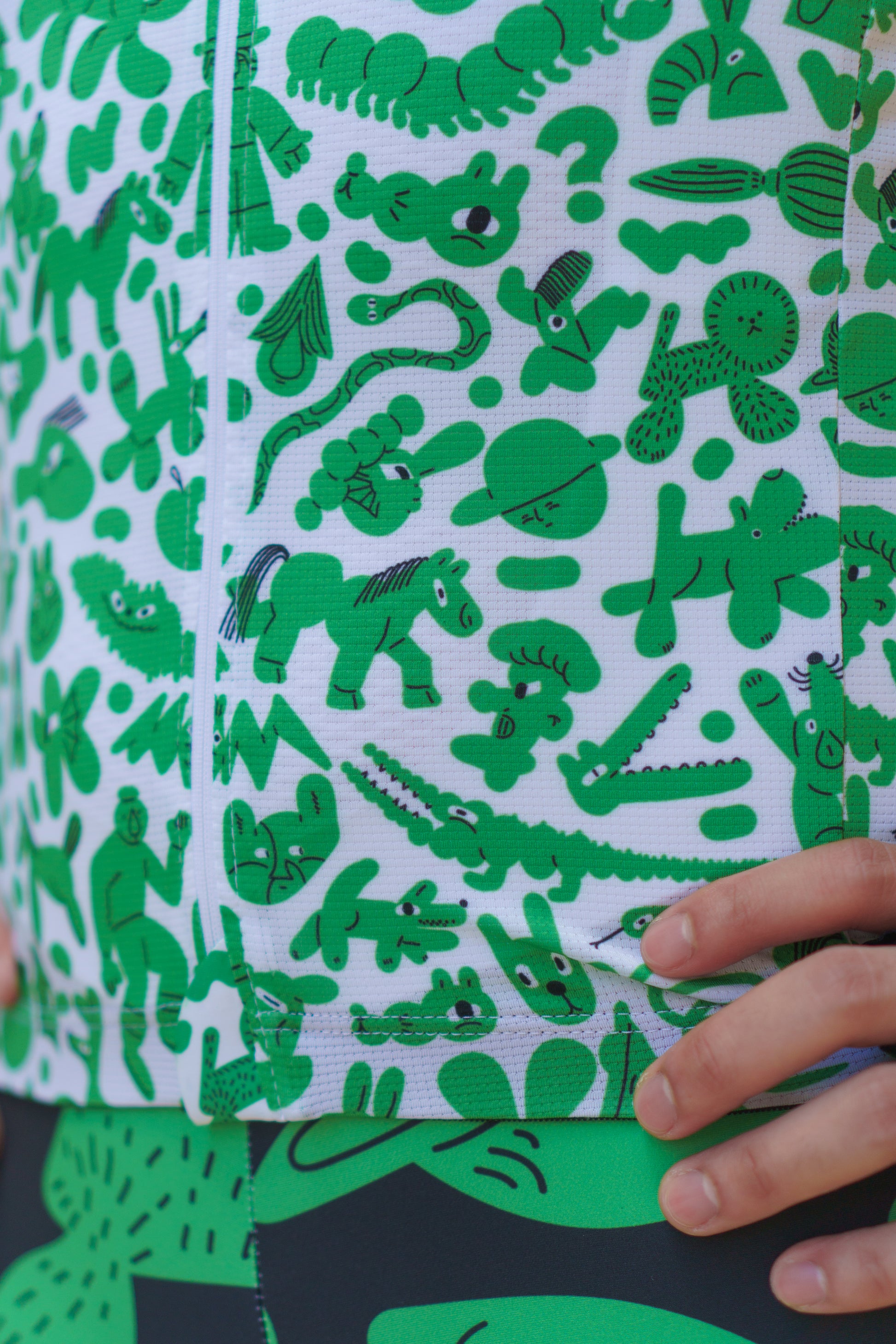 その 太字のグラフィック ジャージの ビブショーツは、成長と活力を象徴する活気ある緑のパレットでBrolgaの象徴的なキャラクターをフィーチャーしています。 アーティスティックパターン 慎重に配置されており、道路上で目立つ一貫した外観を作り出しています。から作られています 高性能ファブリック, このキットは通気性と柔軟性を確保しており、激しいライドにもゆったりとしたクルーズにも最適です。これ エクスクルーシブコラボレーション アートとスポーツの交差点を表現し、サイクリストに個性を表現するユニークな方法を提供します。