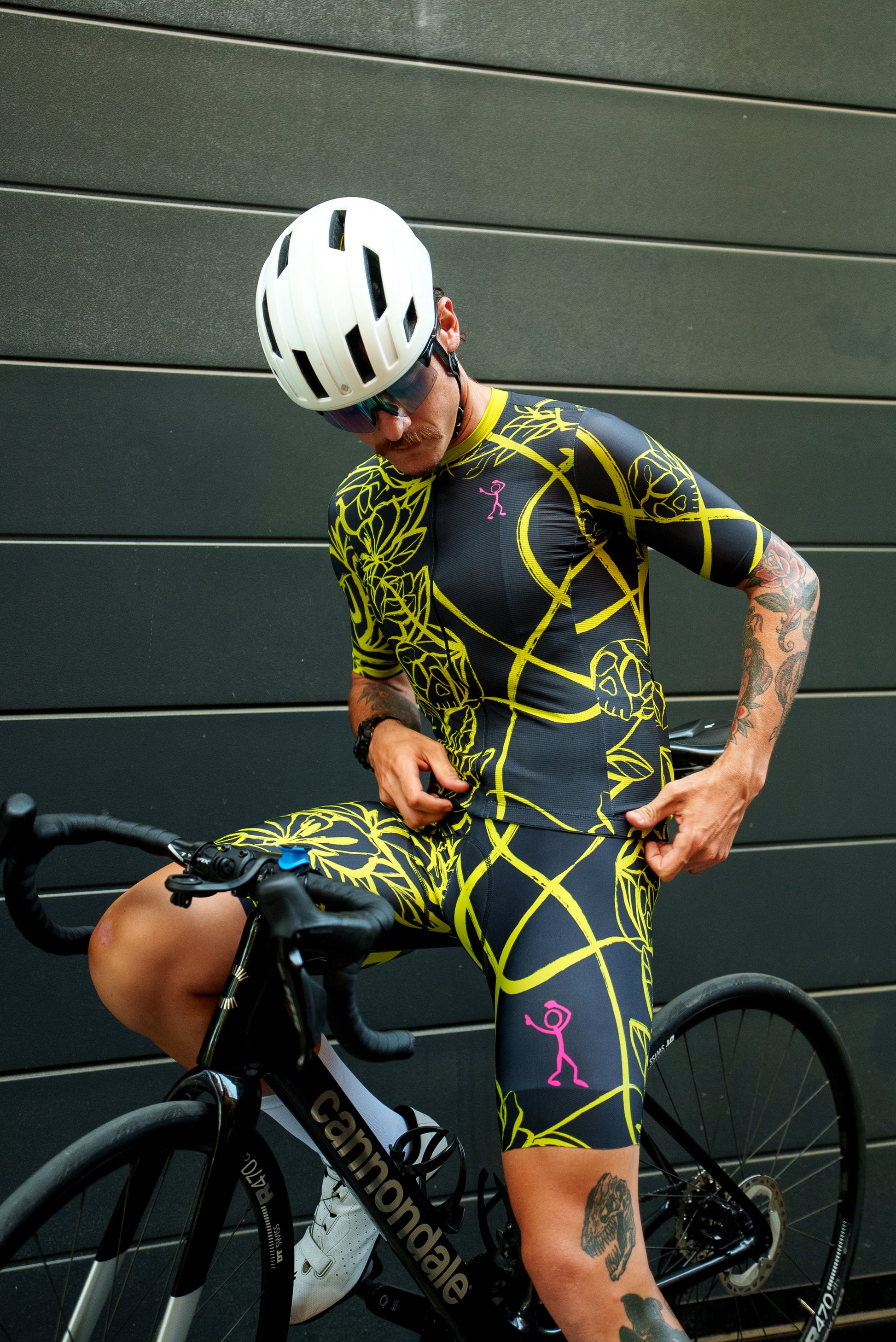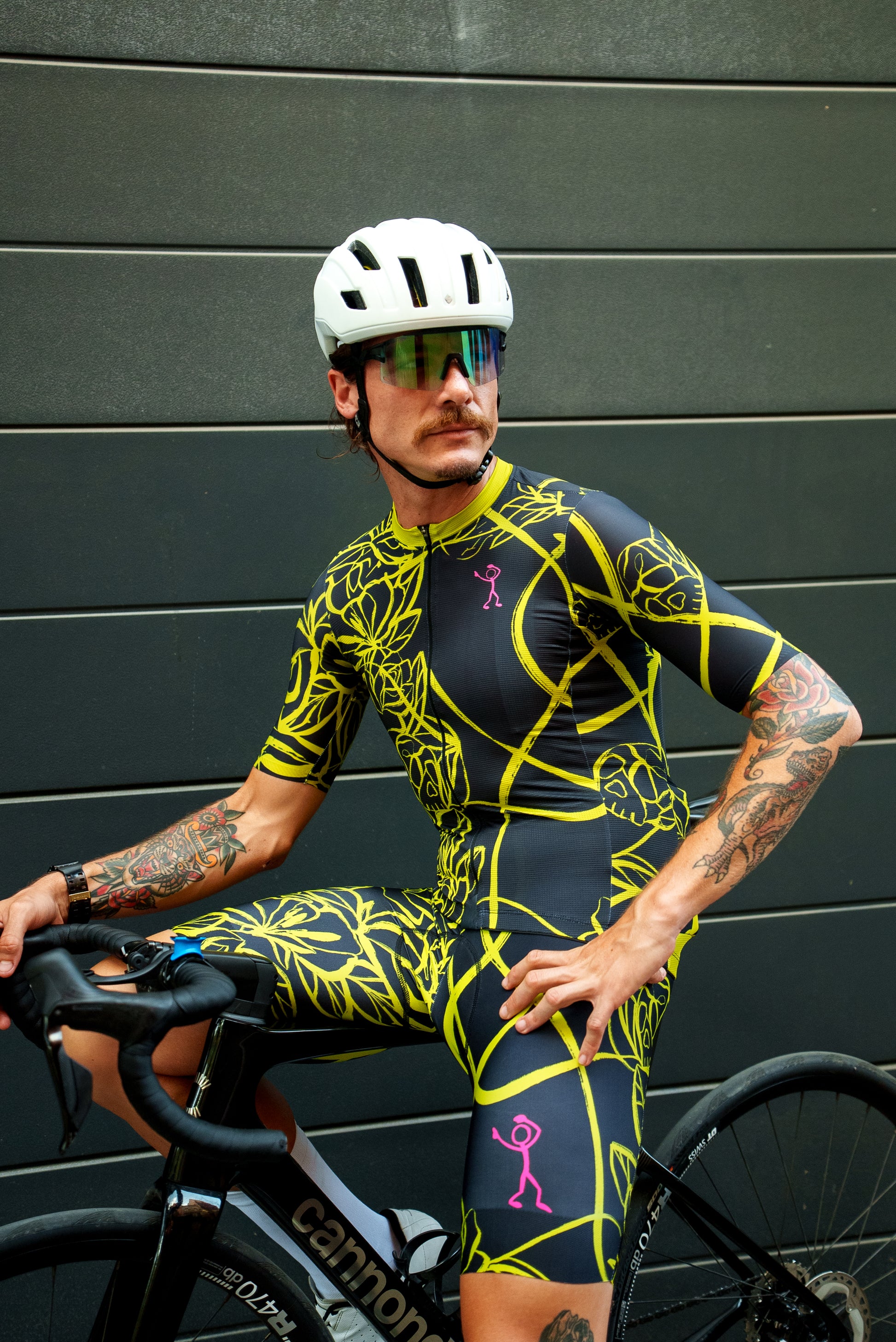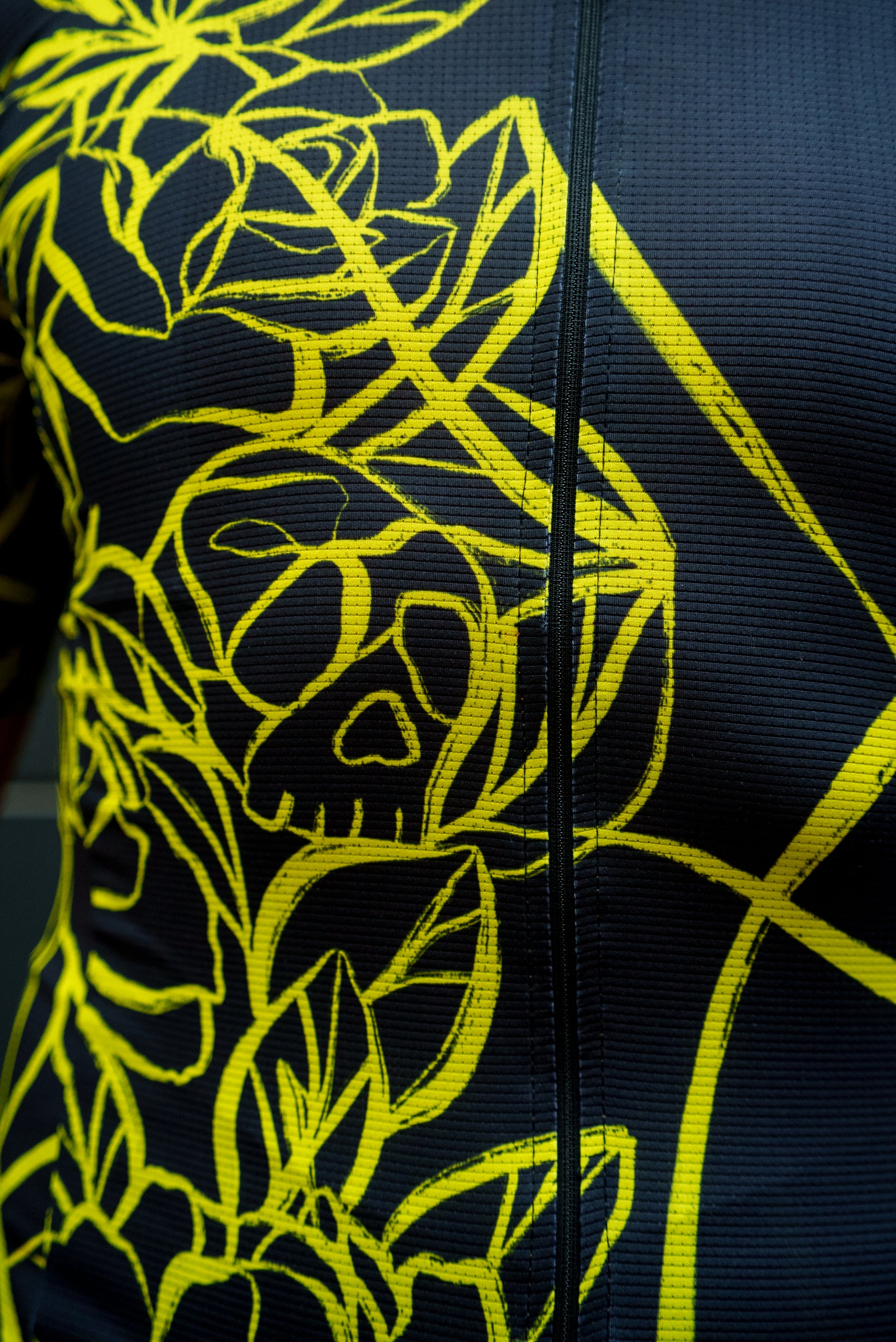 The Skullify Original Jersey is a floral riot with a dark side. Bold skull motifs coil through neon botanicals in a pattern that’s equal parts beauty and menace. Breathable, aerodynamic, and made to stir things up — it’s Stickman at full volume.