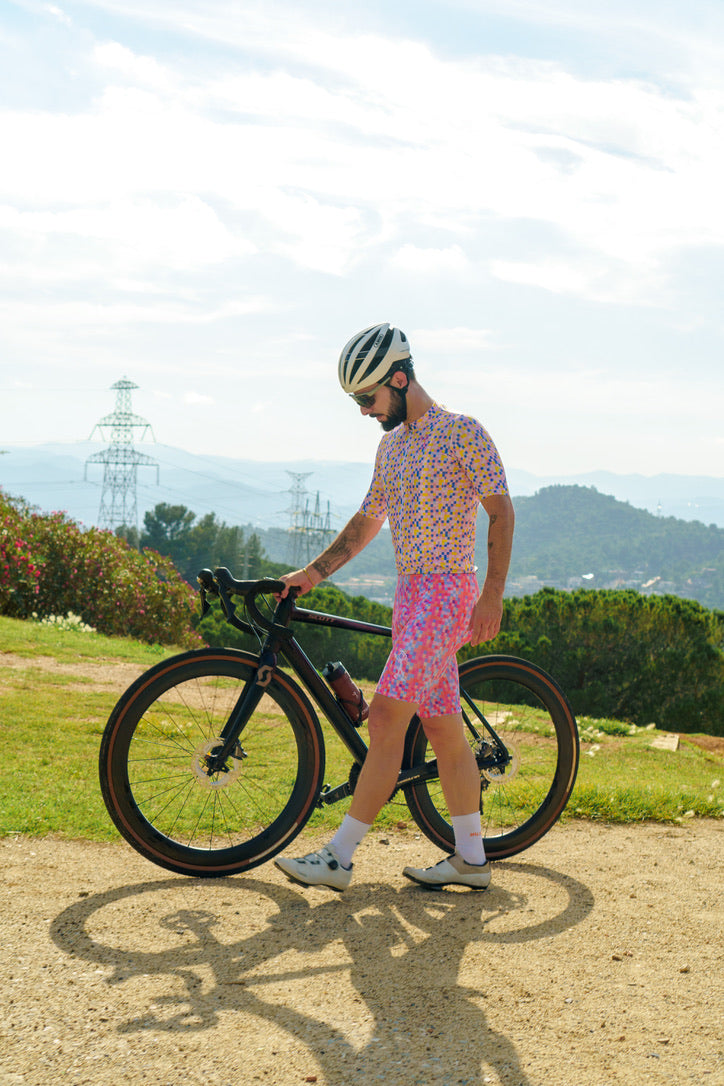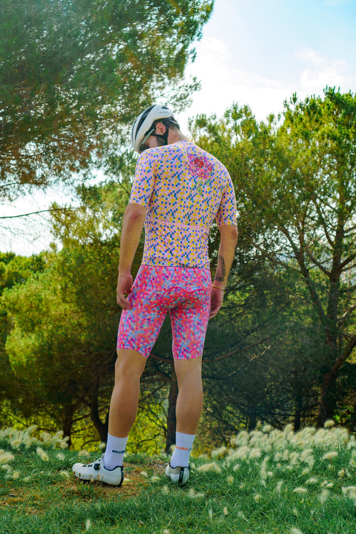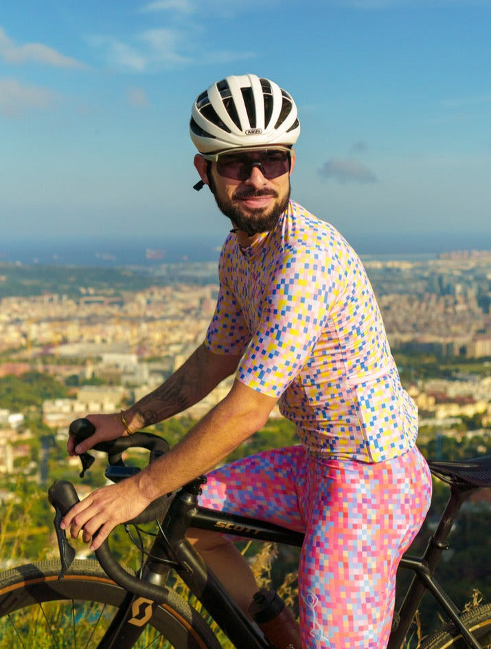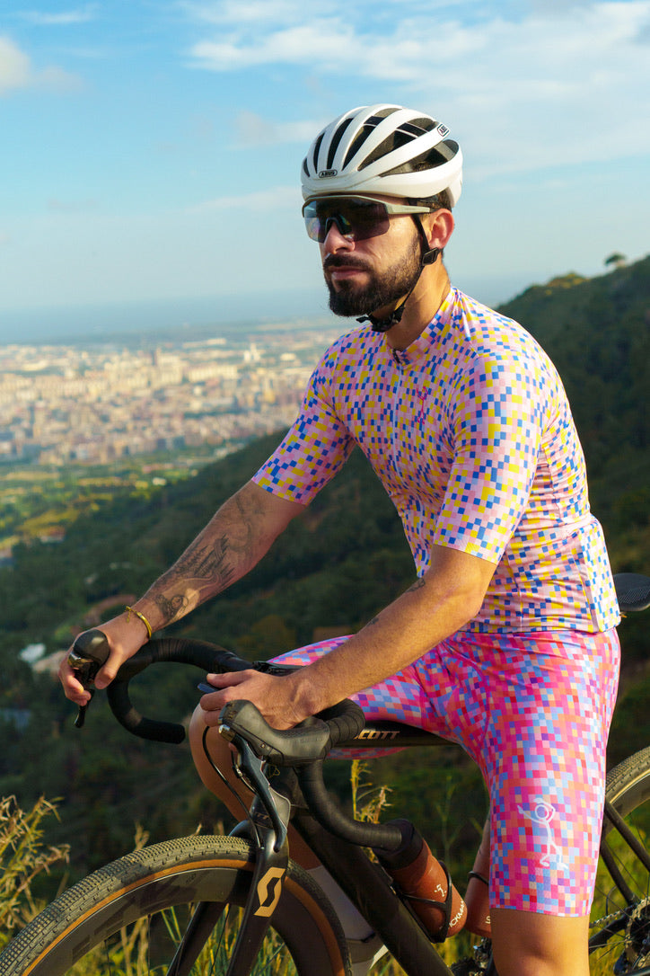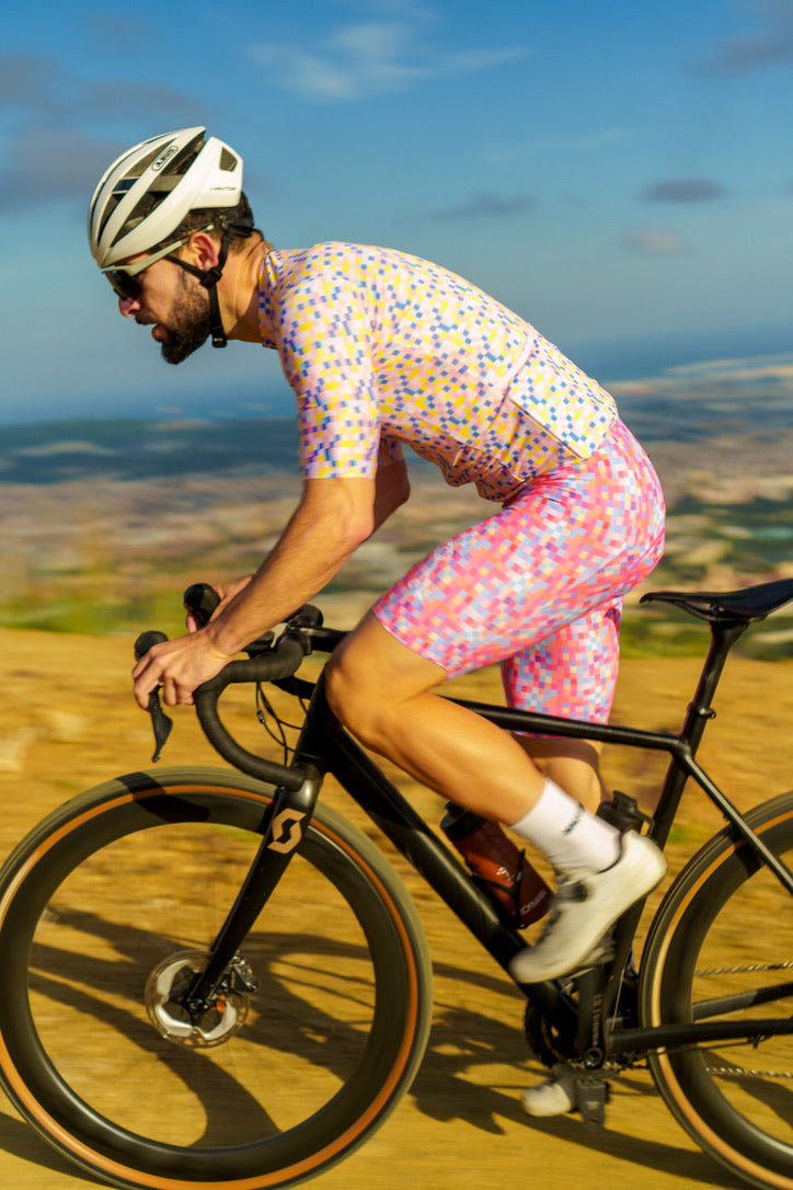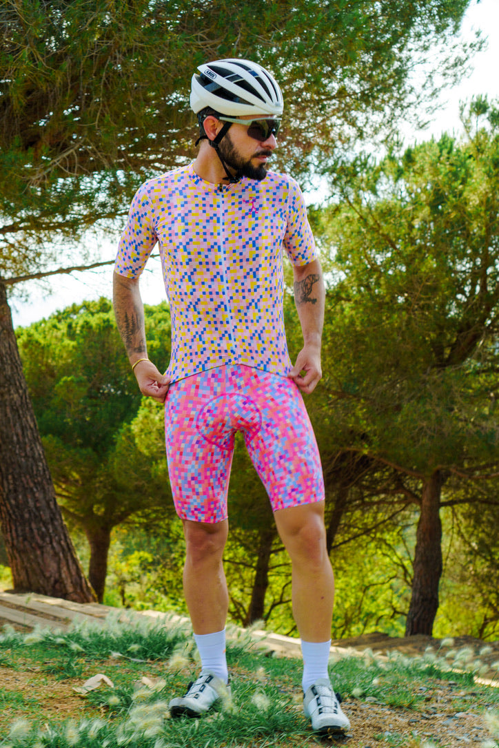 The Stickman Cycling Pixel Bibs are a vibrant addition to your cycling wardrobe, combining modern aesthetics with high performance. Named "Pixel," these bibs feature an intricate mosaic of colorful squares that create a dynamic and eye-catching design. The pattern symbolizes the intersection of technology and artistry, representing the precision and passion that cycling demands. Made with premium, breathable fabric, the Pixel Bibs ensure comfort and flexibility, allowing you to focus on your ride with confidence.
