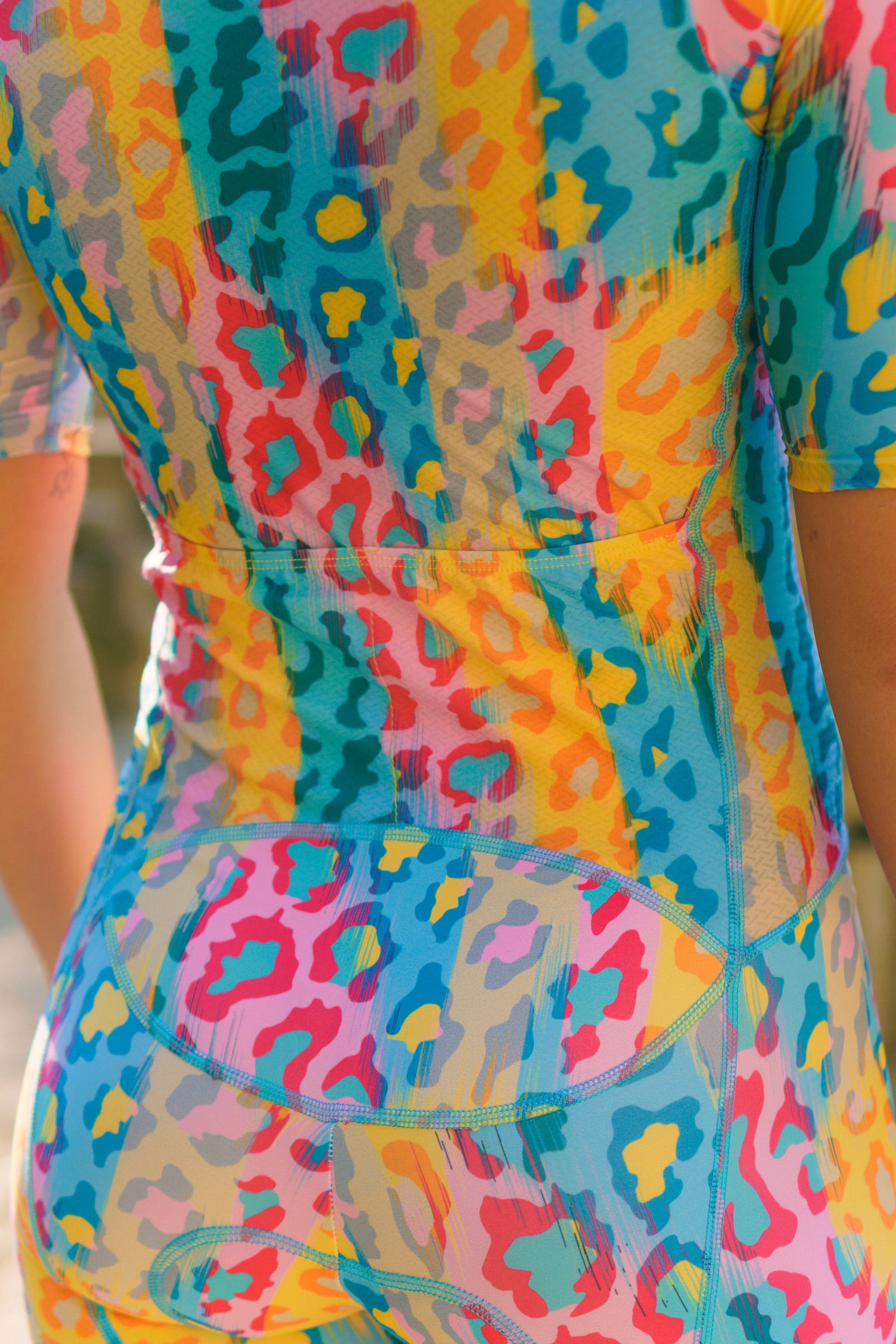 Introducing the Stickman Rainbow Leopard Trisuit—a striking blend of fierce style and high-performance functionality. This design features an electrifying rainbow leopard pattern that merges vibrant blues, bold yellows, and pastel pinks, ensuring you make a statement both in and out of the water. Engineered for athletes who thrive on standing out, this trisuit combines cutting-edge materials with a modern aesthetic, offering unmatched comfort and durability. Whether you're powering through the swim, bike, or run, the Rainbow Leopard Trisuit is your go-to gear for turning heads and leading the pack with unshakable confidence.